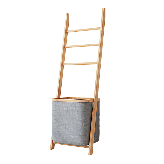 Wall Leaning Ladder Shelf with Laundry Basket Clothes Hamper Bath Towel Rack in Grey