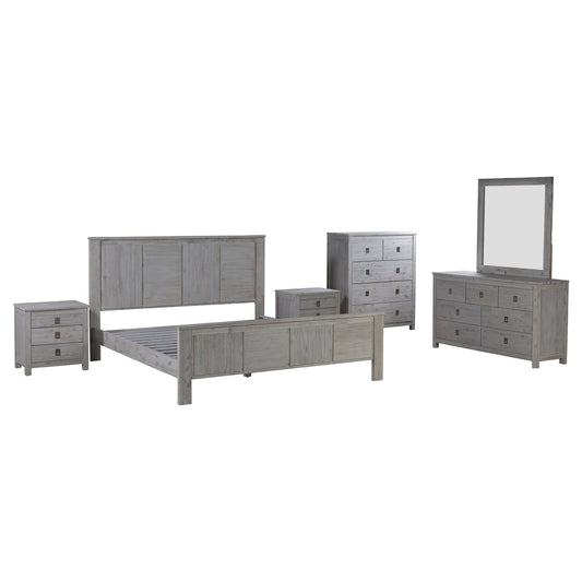5 Pieces Bedroom Suite with Solid Acacia Wood Veneered Construction in King Size White Ash Colour Bed, Bedside Table , Tallboy & Dresser