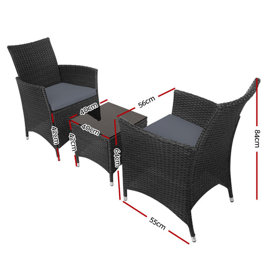 Gardeon 3PC Patio Furniture Bistro Set Wicker Outdoor Lounge Setting Black