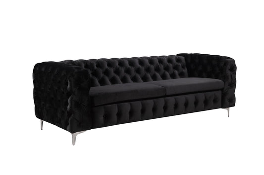 3 Seater Sofa Classic Button Tufted Lounge in Black Velvet Fabric with Metal Legs