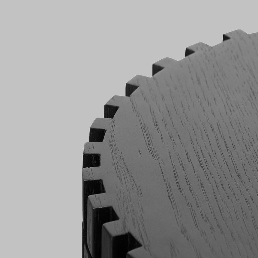 Black base with glass top Engineered Wood base with black veneer Slatted cog style design 30kg weight limit Product comes flat pack and requires two person assembly