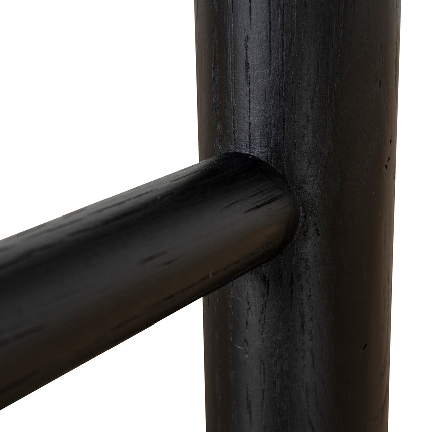 Engineered wood with oak veneer Full black finish with NC coating Vertical wood panel design Oval top shape 1 handleless drawer Push-to-open mechanism Spacious storage compartment Solid oak wood legs Includes legs support Weight Capacity: 70 kg Required two person assembly
