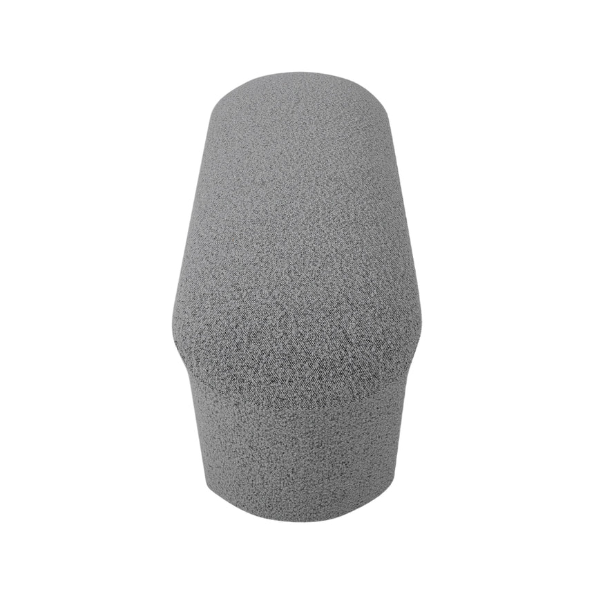 Fabric blend with 85% polyester and 15% acrylic Upholstered in pepper boucle Pine wood timber frame Flat pill-shaped body with all-over upholstery 2x thick plastic side legs with floor protectors Foam filling with retained firmness Suitable for commercial use 180kg weight capacity Product is fully assembled
