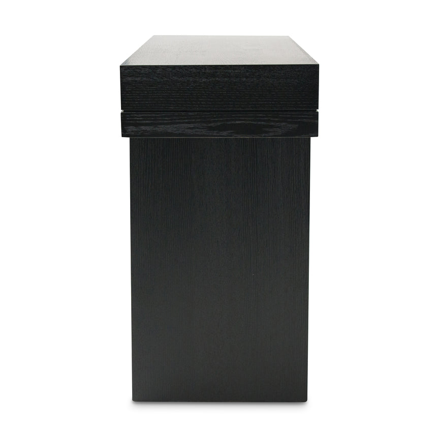 MDF and Oak veneer construction Features a natural wood texture and a dusty oak finish Boasts a shimmering finish with a smooth and clean consistency Designed with height parallax and minimal lines Capable of supporting up to 50kg Supported by 2x column legs with a reeded wood design Minor assembly required