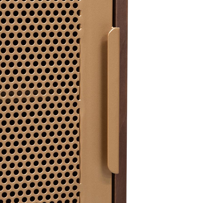 MDF frame with veneer construction Metal leg, 1x mesh door and detailing in brass finish Deep wood grain texture 2x drawers and 5x concealed shelves Fully assembled Note : Due to the nature of timber and veneer, any variations of wood grain and colour are not inconsistencies and should be appreciated.
