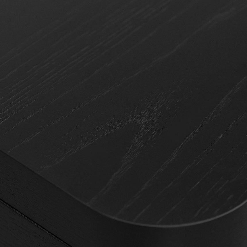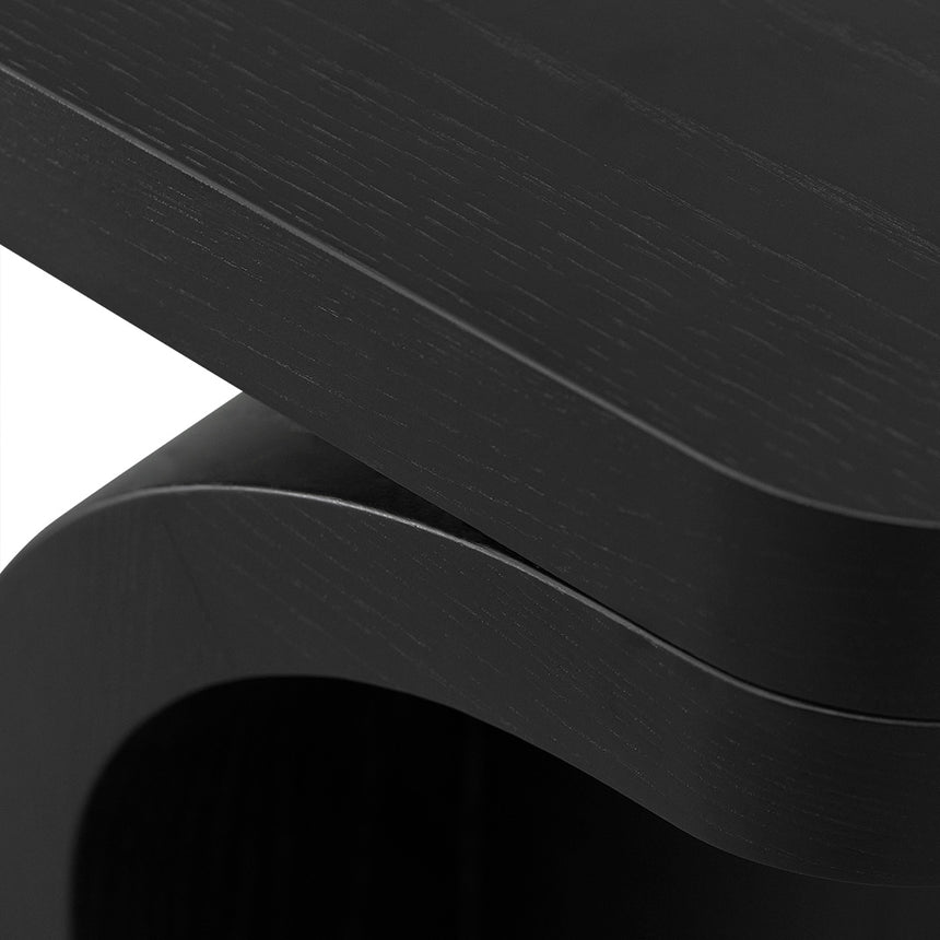 Body and base are made of engineered wood Thick rectangular table top 2x curved legs with floor protectors Finished in Black Oak veneer 60kg weight capacity Product is flat pack and requires two person assembly