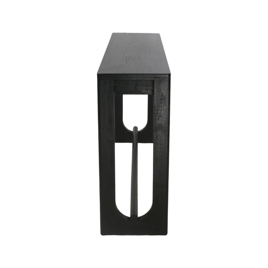 Frame and legs made of elm timber wood Long thick rectangular table top All-over black finish instating the wood texture 3x drawers under the tabletop 2x flat side legs designed with arched cut-out Legs are connected with a round stretcher 50kg weight capacity Suitable for commercial use Product is fully assembled