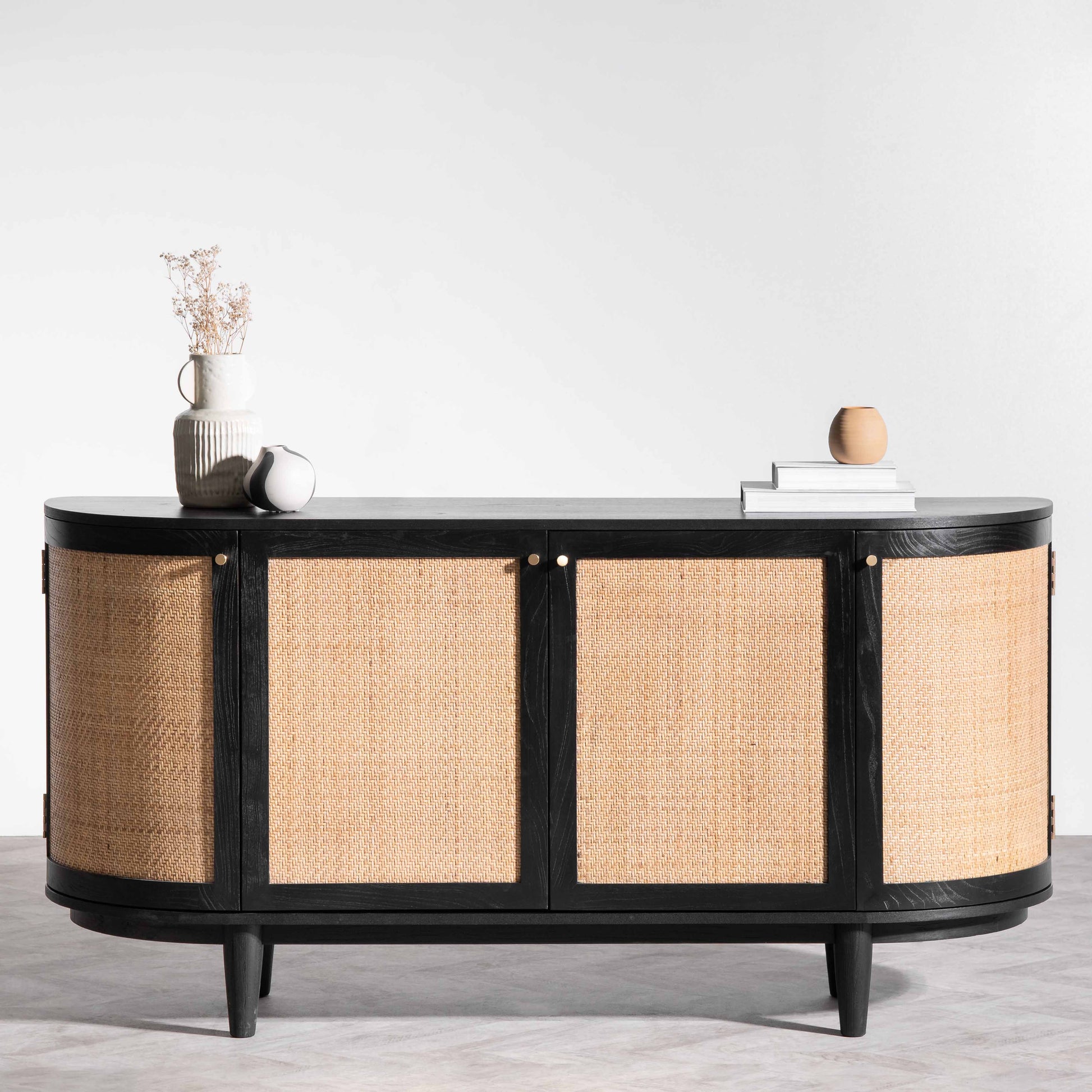 The 1.7m Black Elm Sideboard - Rattan Doors is a stunning blend of contemporary design and timeless charm, offering a perfect balance of form and function. With its sleek black elm frame, intricate rattan door details, and spacious storage, this sideboard effortlessly elevates any living or dining space.