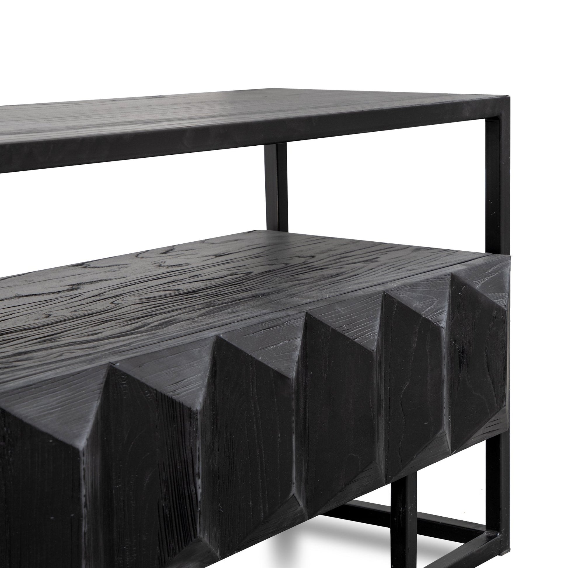 The 1.8m TV Entertainment Unit - Full Black features a striking powder black finish paired with unique natural wood drawers. Its bold, moody exterior is designed to wow and impress guests, making it an iconic piece in any living space.