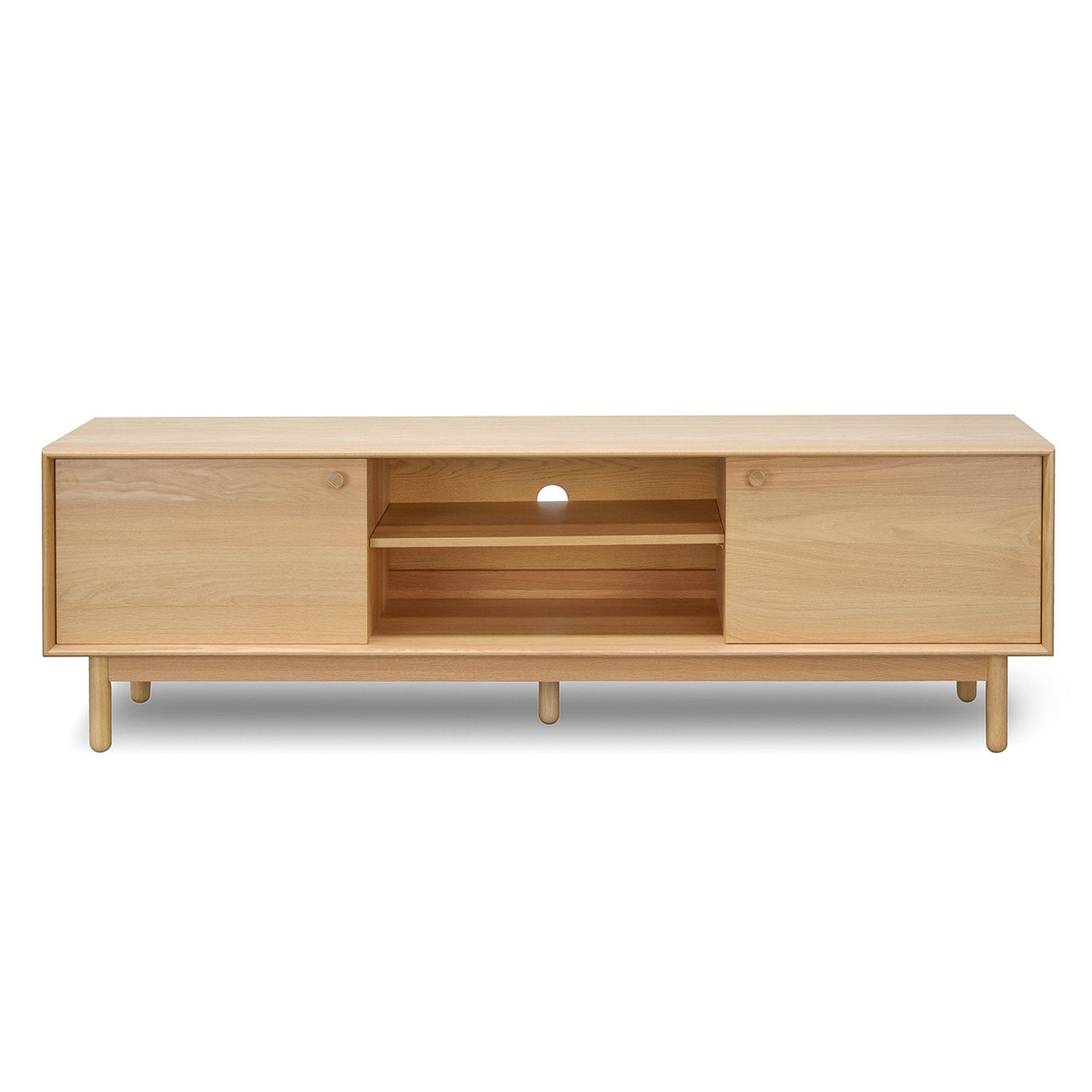 Choose the 1.8m TV Entertainment Unit for a large practical solution to your entertaining needs. In a natural oak veneer, this unit offers ample storage with 2 cabinets and a middle shelf in a timeless and minimalist design. Organize your media essentials with this stylish and functional piece that adds a touch of elegance to your living room or entertainment space.
