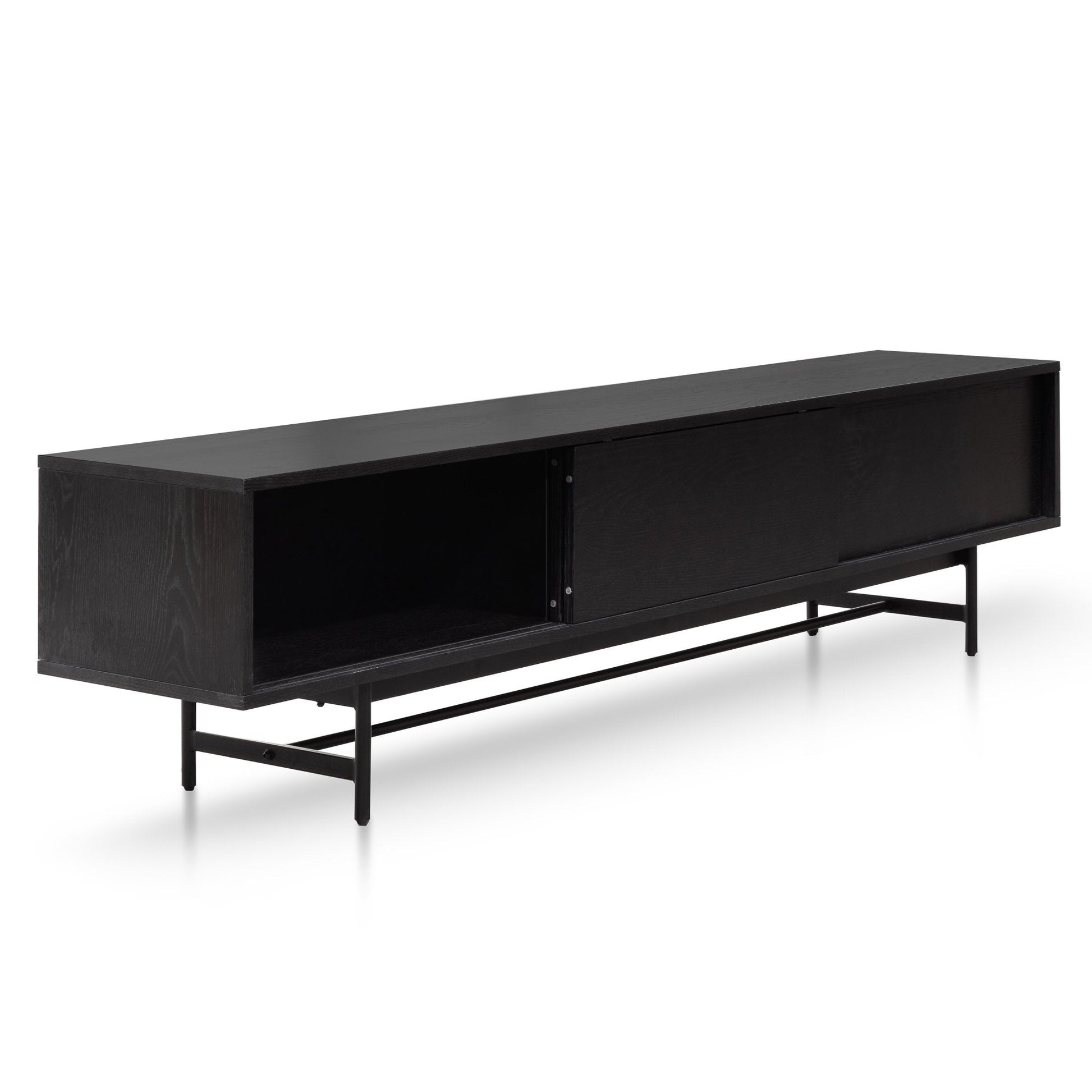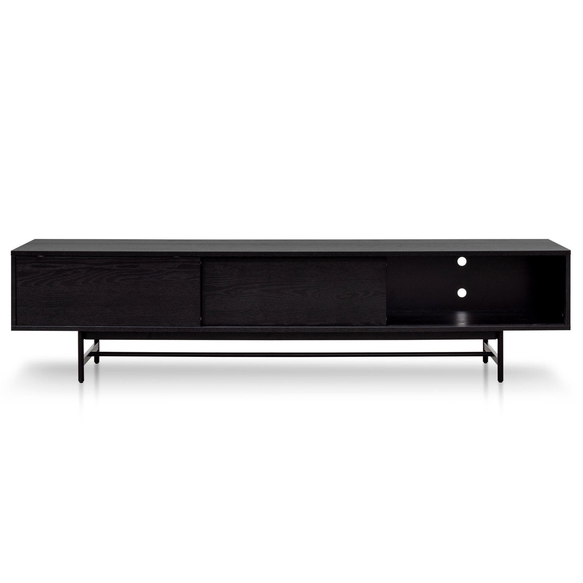Elevate your living space with this sleek and modern 2.1m Wooden entertainment TV unit in full black. Featuring a black oak veneer finish and black powder-coated metal legs, this unit offers ample storage with three sliding doors and six cable management holes for a tidy, organised setup. Its minimalistic design and versatile storage compartments make it a perfect fit for any contemporary space. Enjoy both style and practicality with this elegantly crafted unit.