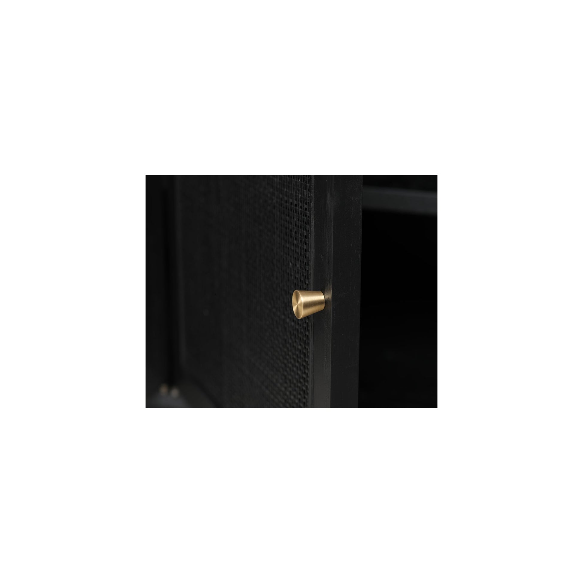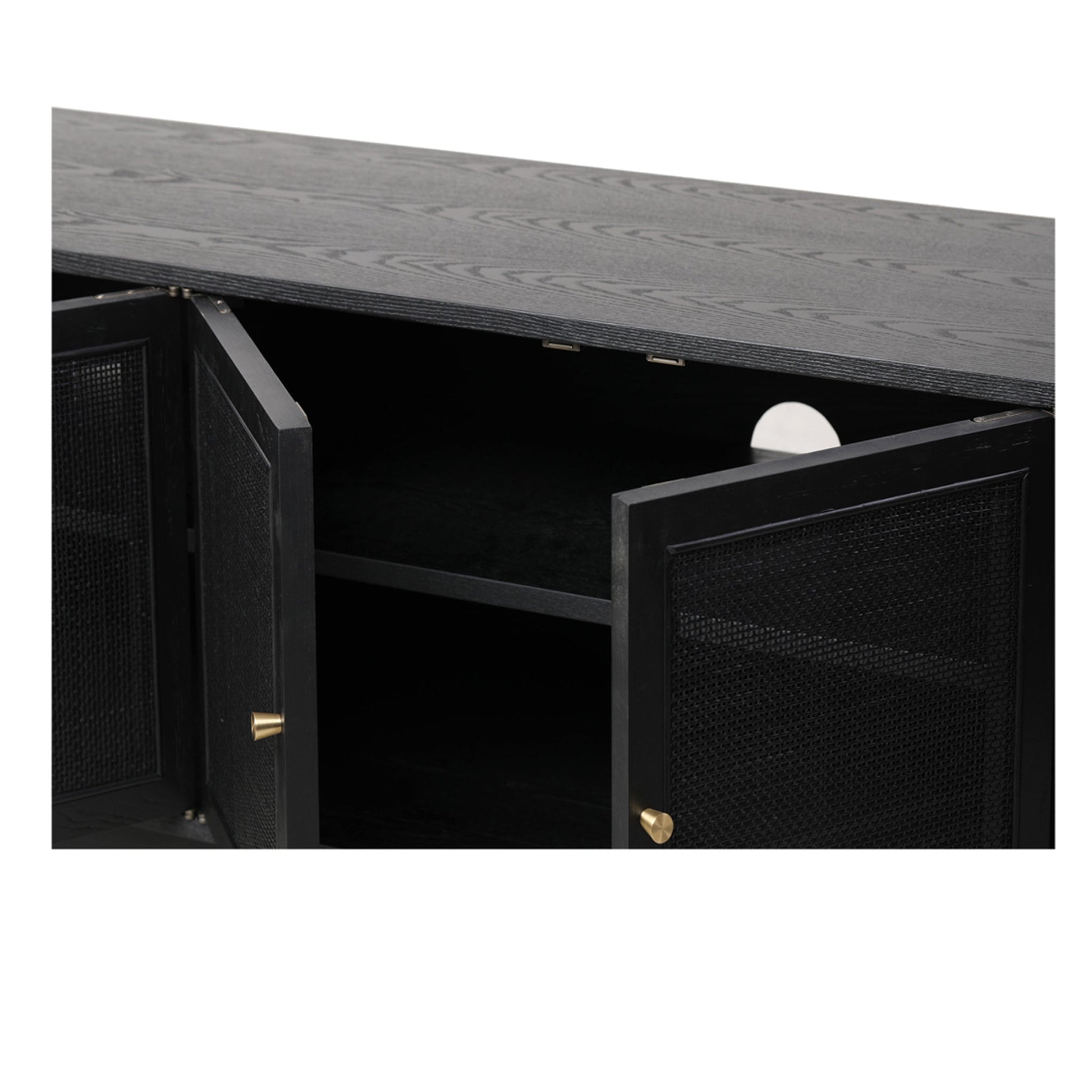 Make a bold statement in your living room with the 2.2m Rattan doors TV entertainment unit - full black. Featuring a striking matte black finish, rattan woven doors, and brass accents, this unit effortlessly combines functionality and style. Perfect for storing your media essentials while adding a touch of modern elegance to your space.