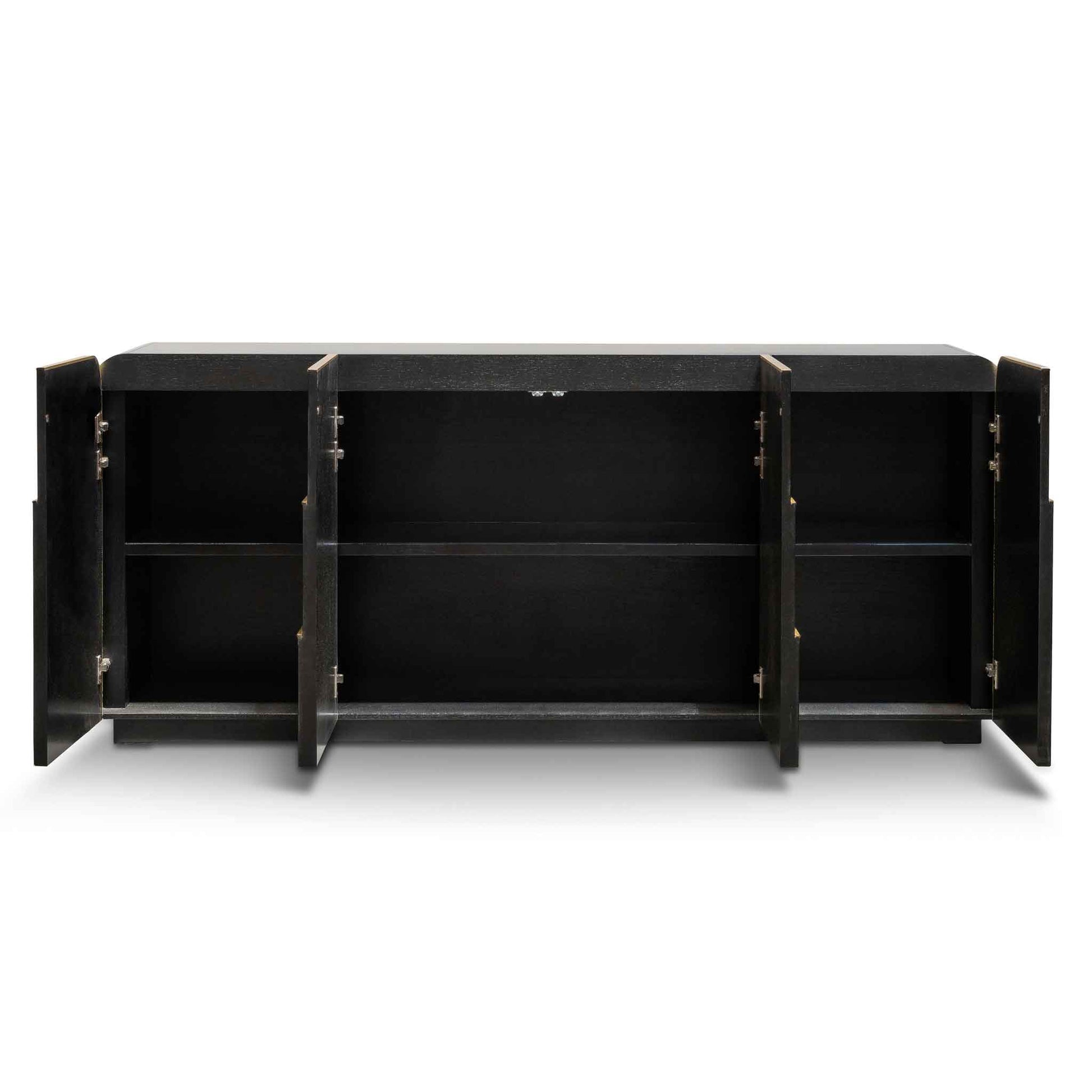 The 2m Buffet Unit - Textured Espresso Black combines bold sophistication with practical functionality, creating a striking storage solution for your living or dining space. Its curved silhouette, deep wood textures, and brushed brass accents evoke modern elegance, while the ample storage space ensures practicality. This beautifully crafted piece effortlessly blends contemporary design with timeless appeal, making it an exquisite addition to your home.