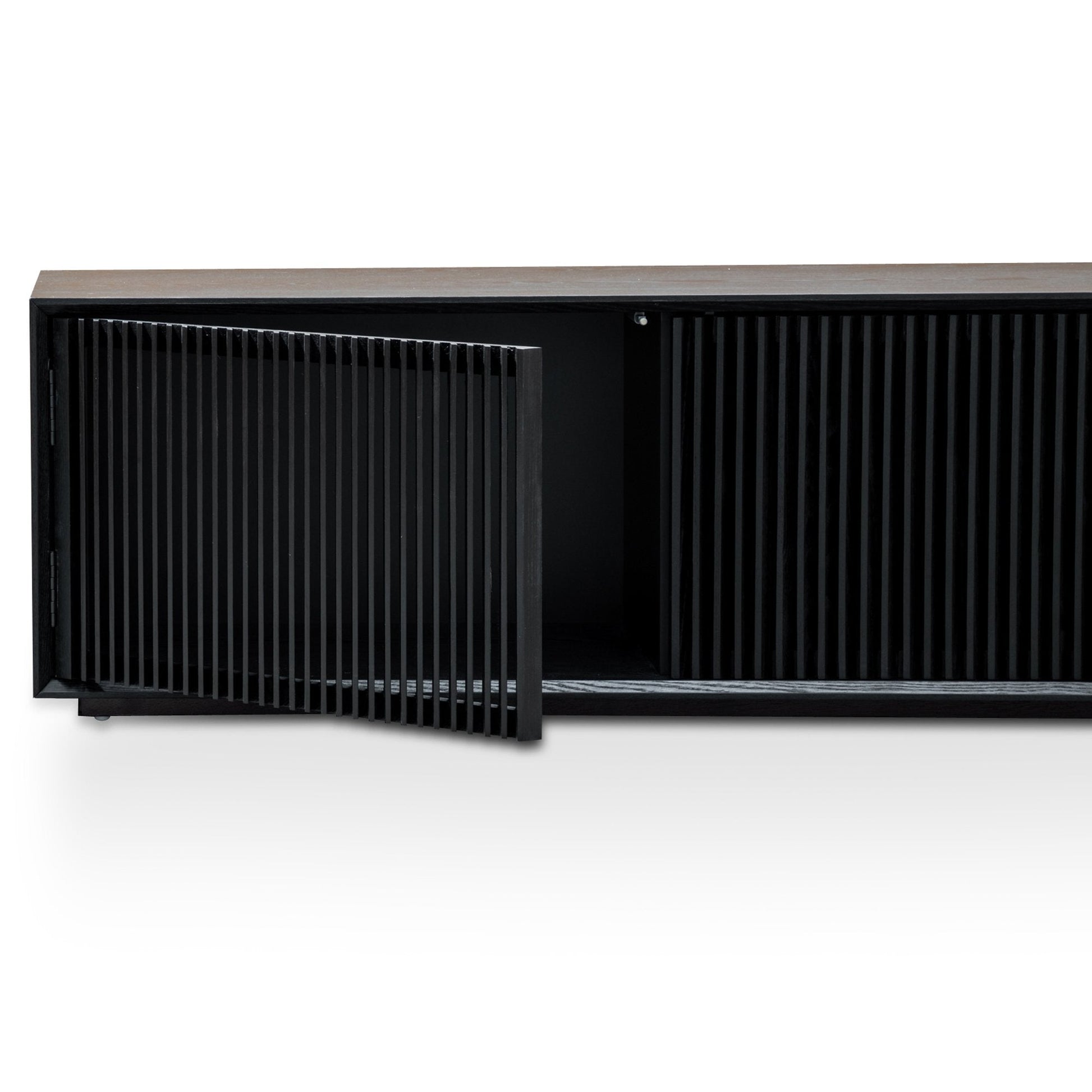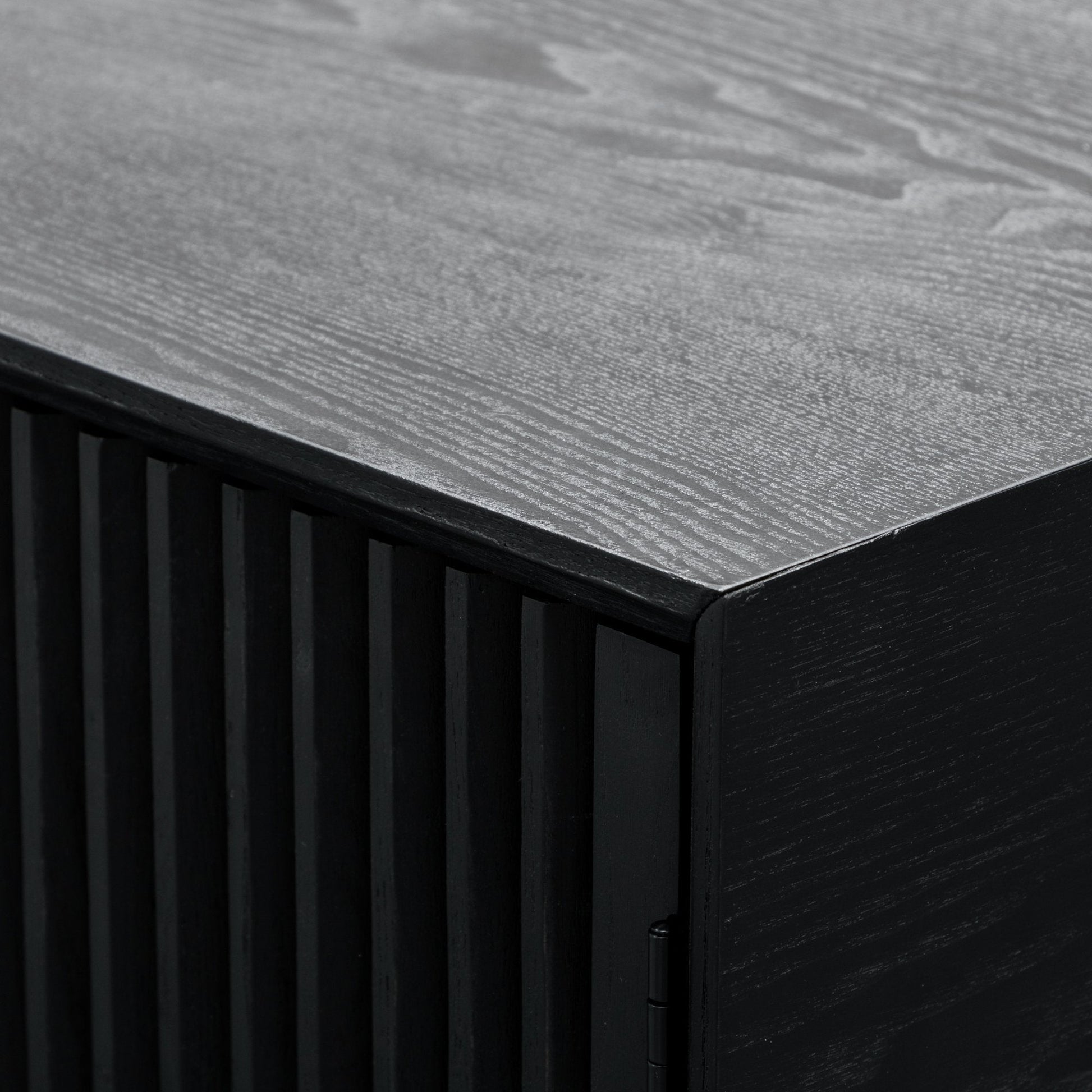 Enhance your living room with the sleek and modern 2m Entertainment TV Unit in Black Veneer. Its compact yet spacious design maximises storage, while the stylish slatted doors add a chic, contemporary touch to your space.