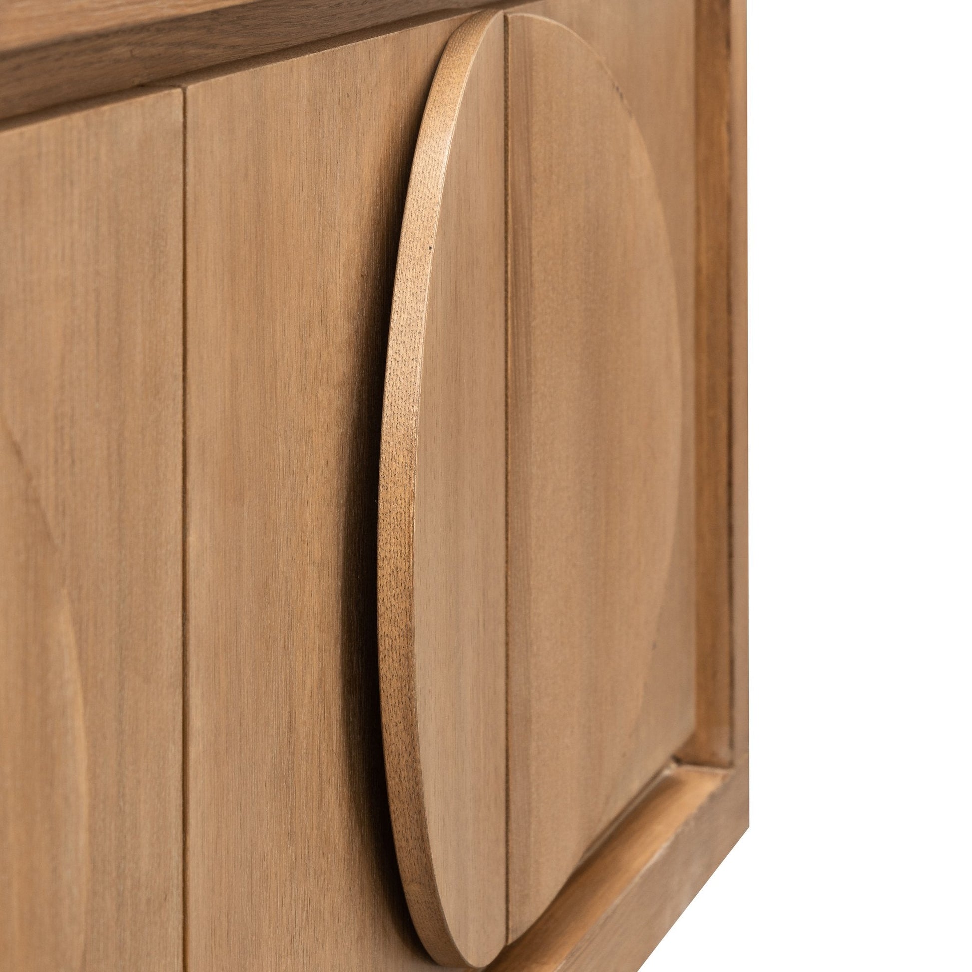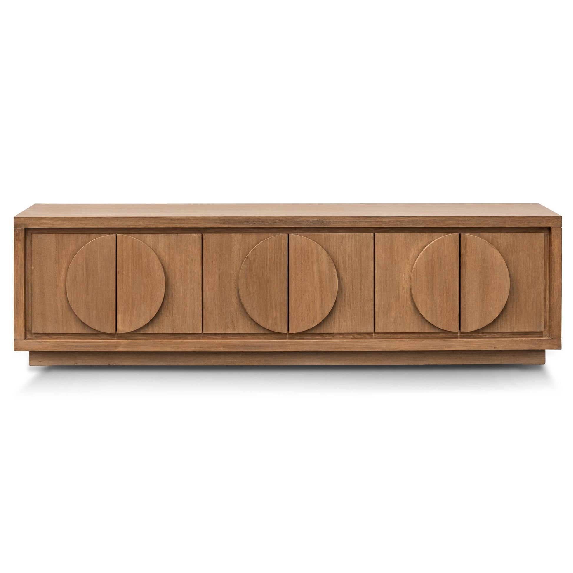 Maximise your organisation with the ample storage options of this 2m TV Entertainment Unit in Dusty Oak. Featuring a dusty stained oak timber veneer finish, this unit comes with six cupboard doors and three spacious compartments, providing an ideal solution for your storage needs. The elegant half-moon handles complement its refined design, making it a stylish addition to any living room.