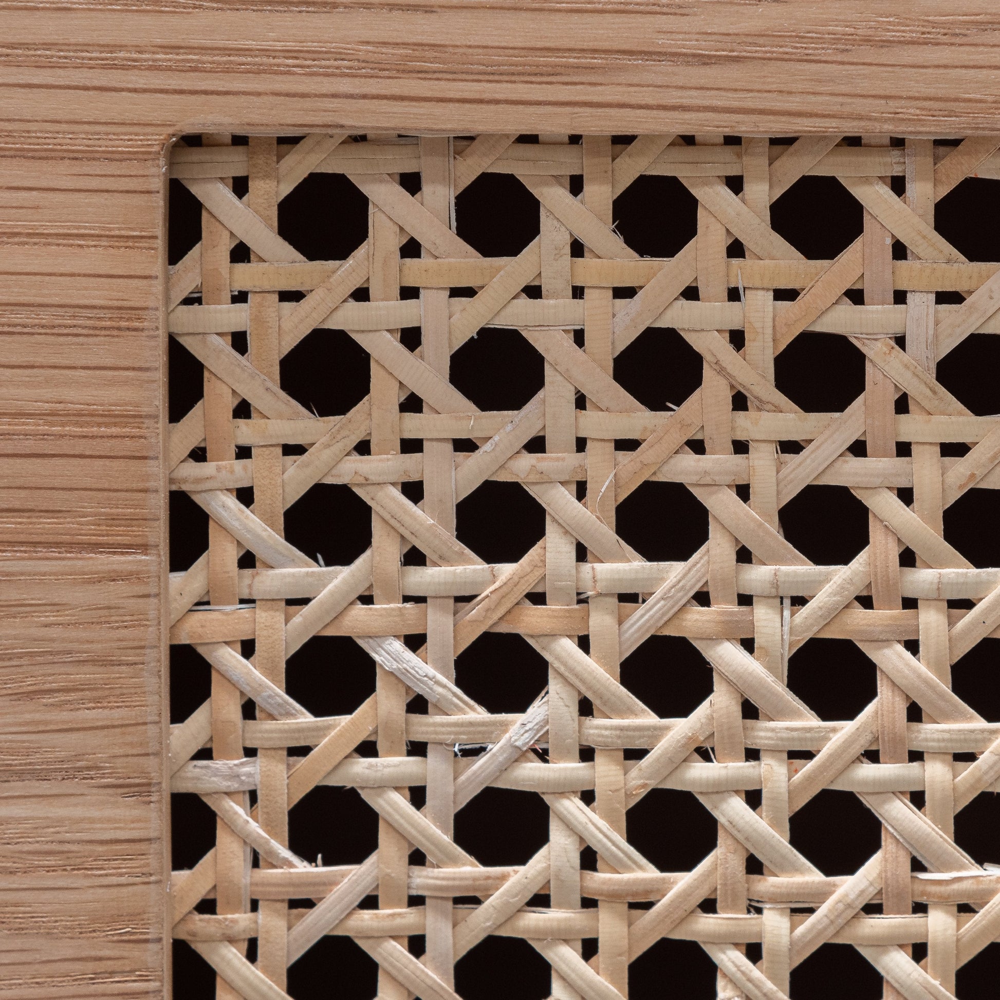 - Design: Black powder-coated metal legs and rattan weave sliding doors