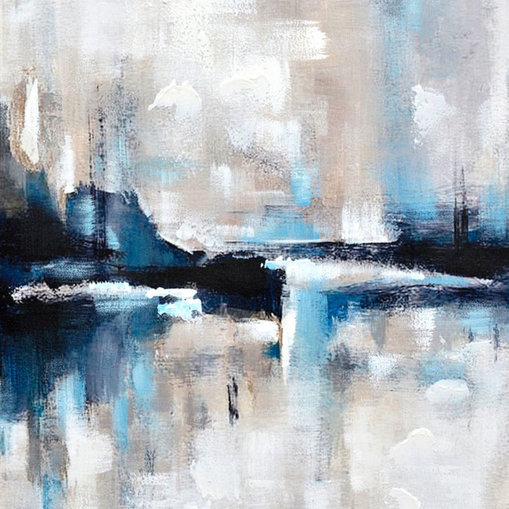 Using a subtle and traditional colour palette, vivid brush strokes of blue, black, white, beige and grey combine to create an abstract horizon scene in Almost Famous enhanced canvas print. The texture and symmetrical reflection in this piece adds to its mystical charm. Almost Famous is mounted in a simple black shadow box frame, complimenting the piece perfectly.