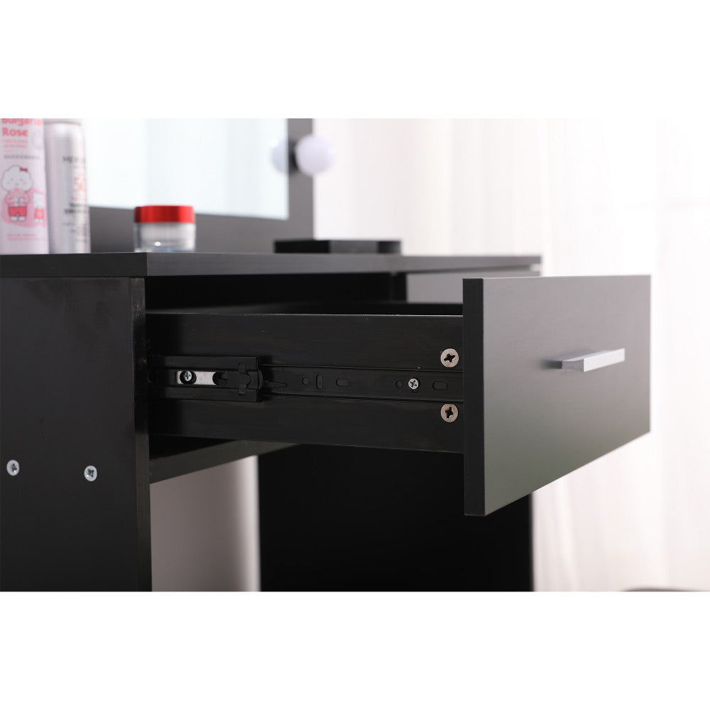 The vanity set is decorated with 12 LED lights and offers 3 light colors to make makeup application easier. The large mirror ensures you look great from every angle, adding a touch of Hollywood glamour to your bedroom. The set also includes two large drawers for storing cosmetics, perfumes, hair accessories, and other beauty supplies. The simple black finish makes the dressing table easy to clean and maintain. The matching sponge stool adds softness and comfort to your makeup routine.