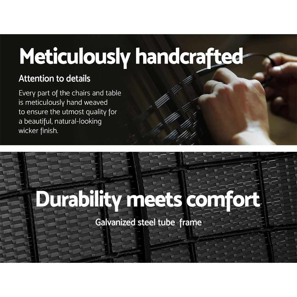 Meticulously crafted, our Gardeon 4-piece Rattan Outdoor Set comprises a chic loveseat, two single armchairs and one matching side table for a beautiful integrated look. Its presence will definitely add panache and style to your deck, patio or even living room. Made of PE wicker and a sturdy steel frame, this set is designed to last through all weather and the test of time. The 5mm tempered glass top for the side table also ensures a strong and safe use with total peace of mind. Not least, the cushion covers are removable and washable to maintain their pristine appearance.