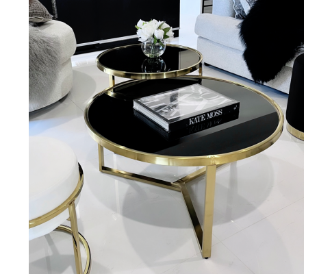 Crafted with an elegant brushed gold finish and a sleek black glass top, this coffee table set exudes sophistication and style. The round shape adds a touch of modernity, making it a perfect fit for any contemporary interior.
