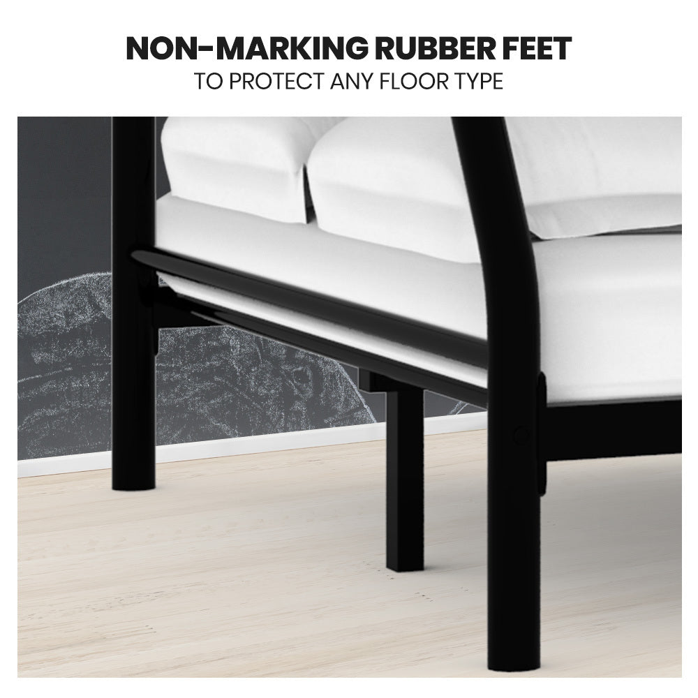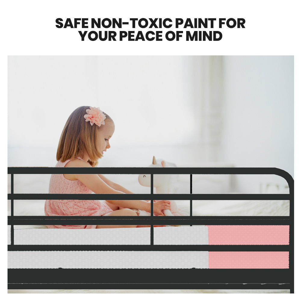 The strong tubular metal frame has a matte dark grey non-rust finish with matching fasteners–so this bunk bed not only looks great, but is also built to last! Soft rubber feet ensure that the bed can be placed on any floor type without the risk of scratching. With safety in mind, this bunk bed has no sharp edges and smooth welded joints. It also features a solid and secure fixed ladder that is easy to climb without the wobbles of other less sturdy bunk beds.