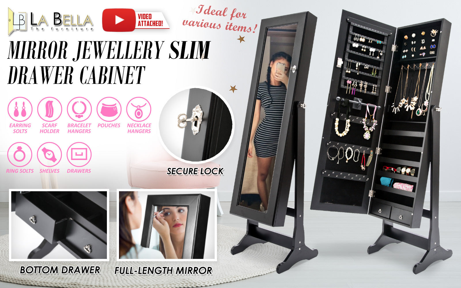 This high-quality La Bella LOWE Mirror Jewellery Cabinet is ideal for you if you need a compact and stylish storage option for your precious accessories! The mirror is a full-length dressing mirror so you can enjoy the convenience of having a mirror instantly available to check out how great your jewelleries fit with your dressing! It features 2 bottom drawers, more convenient for the storage. It will blend in well in any room and this is for sure a great solution if you want to keep your jewelleries and room tidy.