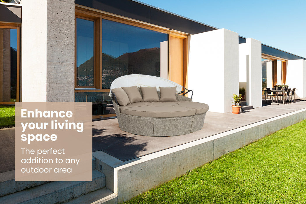 The day bed is fitted with a retractable roof canopy which can be adjusted depending on how much shade you require. This premium piece of outdoor furniture comes with four throw pillows, and is designed to stand the test of time and provide utmost comfort.Â