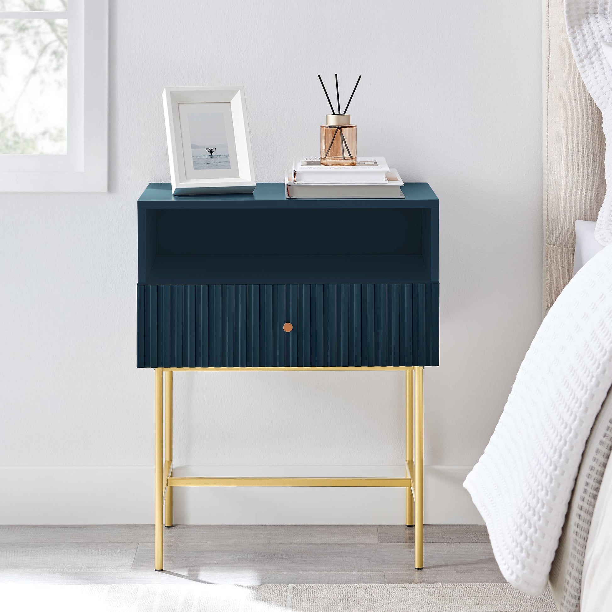 Introducing the Lucia Slender Fluted Bedside Table in Blue, a stylish and functional addition to any bedroom. Made with high-quality materials, this bedside table features a painted MDF body and drawer front, as well as 13mm metal legs for durability and stability. The painted finish in a beautiful shade of blue adds a touch of elegance to any room.