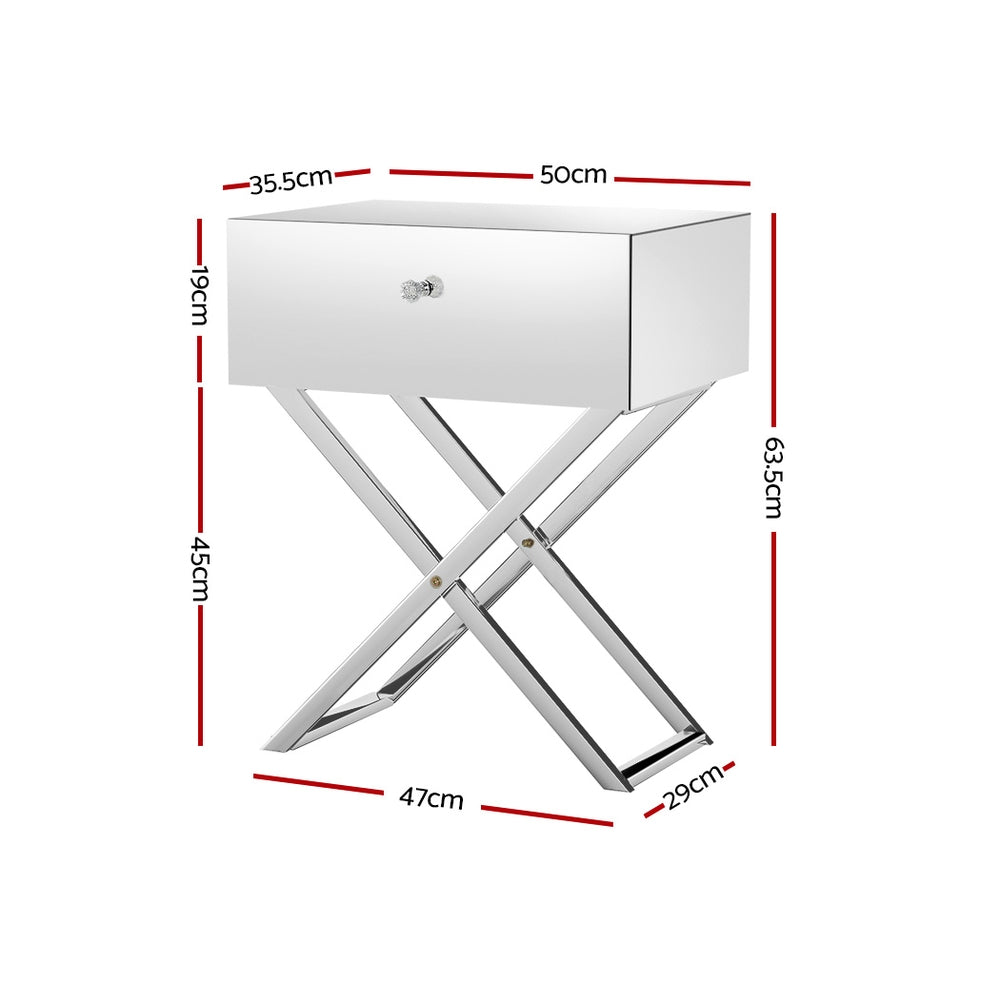 Introducing the Artiss Mirrored Bedside Table Drawers Side Table Storage Nightstand Silver MOCO, a glamorous addition to any bedroom. Crafted from solid MDF board with mirrored glass panels, this bedside table is not only stylish but incredibly durable. The stainless-steel cross-legged design provides additional support and the generous-sized storage drawer is fronted by a gorgeous crystal knob. With a weight capacity of 20kg, the tabletop offers ample space for your bedside essentials or can be used as a side table next to your favourite armchair. Easy to assemble and maintain, this bedside table is a must-have for any modern home.