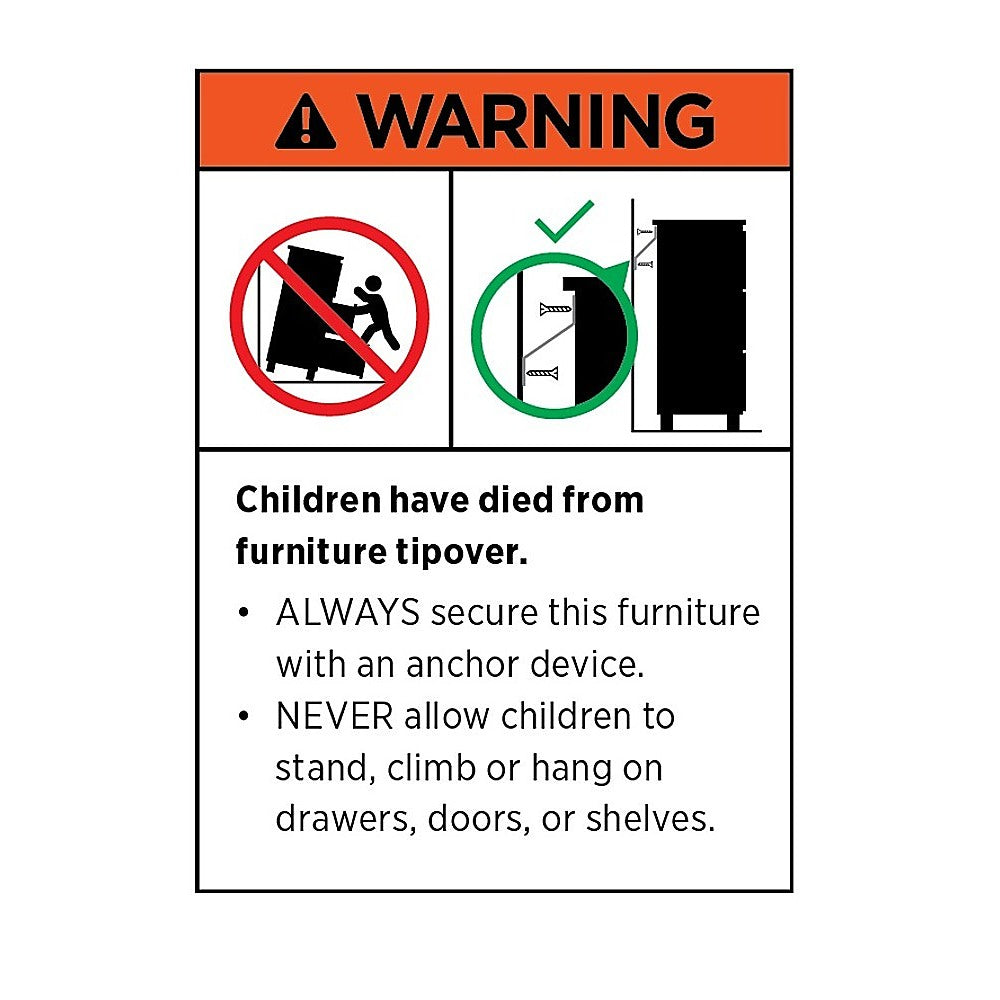 NEVER allow children to stand, climb, or hang on drawers, doors, or shelves.