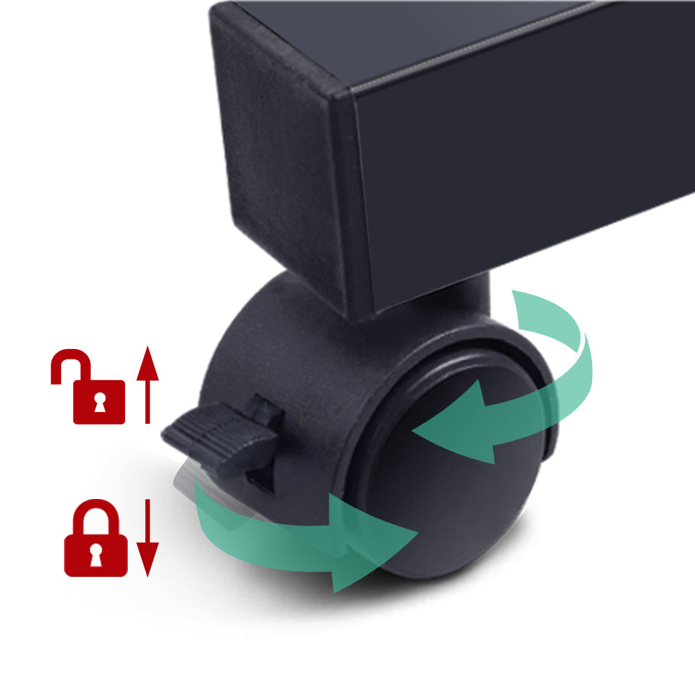 Introducing our Laptop Table Desk Portable in sleek black, perfect for any modern home or office. This versatile desk is designed to be both strong and lightweight, making it easy to move around and adjust to your preferred height. The U-shape design allows for a comfortable sitting position and fits well with most furniture. The 360 degree rotating castor wheels can be locked in place or removed for a more permanent fixture. The desk top is made of 17mm thick MDF board and supported by a sturdy powder-coated H-shape steel frame, making it suitable for various uses.