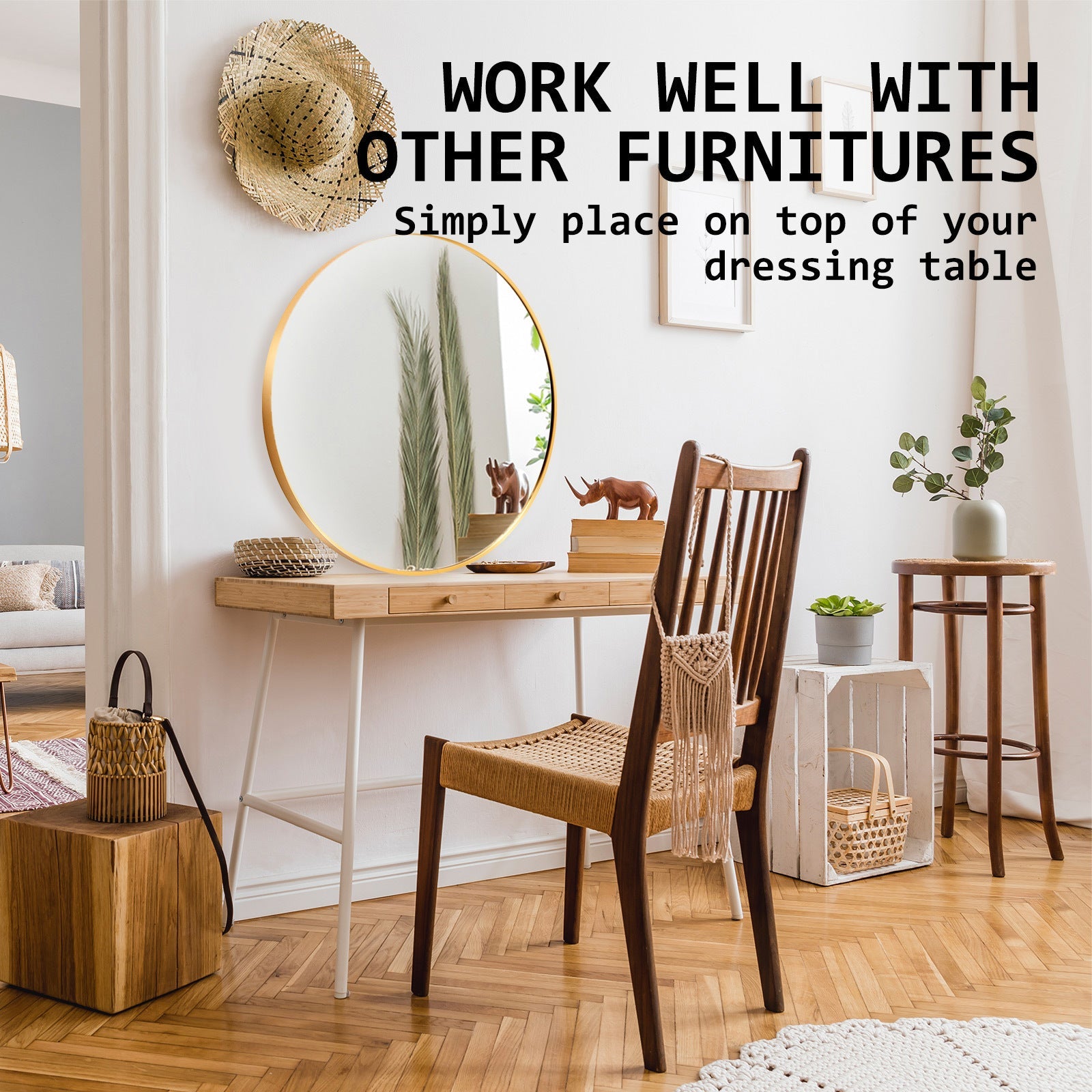 The round mirror is modern and clean in design and comes with a 3.9cm thickness minimalistic aluminum frame that is sure to capture the attention of all. Plus, its curved lines all around will become a central focal point in any room which makes spaces feel more inviting and relaxing.