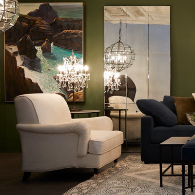 The simplicity of this floor mirror is encapsulated in the black powdercoated iron frame with nine preciously inlaid panels of bevelled antique mirror. This floor mirror leans against the wall perfectly in any part of your home
