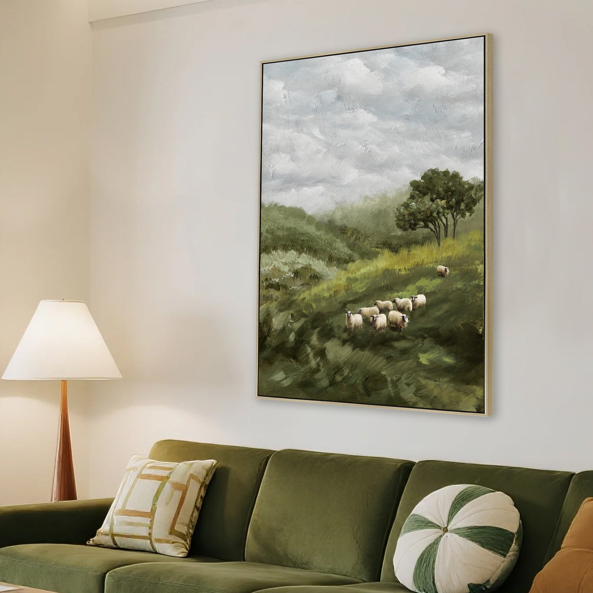 Bringing a touch of calm and nature to your space, CAR12184-CLO 80 x 120cm Framed Canvas in Natural portrays a peaceful countryside with grazing sheep under soft, tranquil skies.