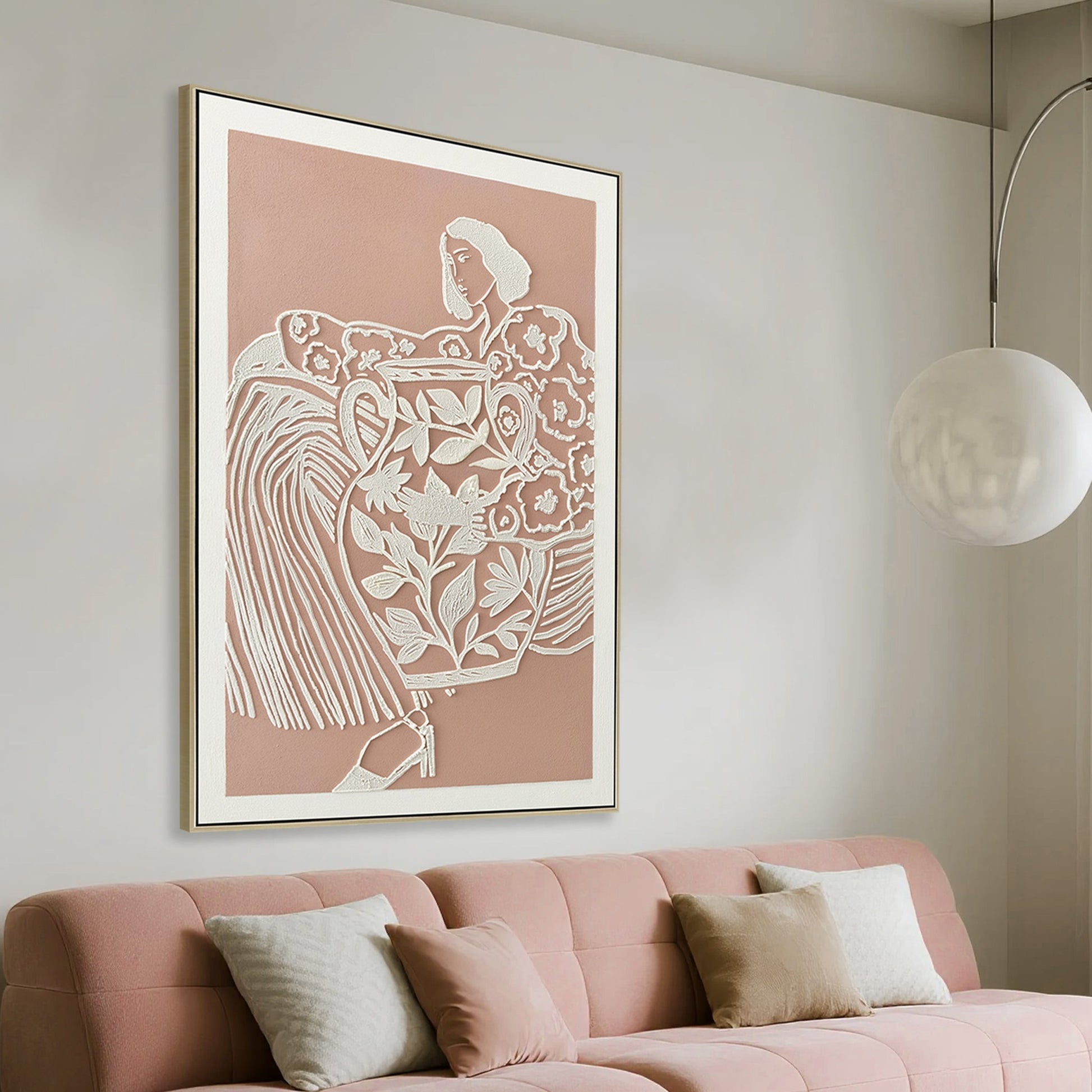 Portraying a serene muse amid blooming motifs and flowing lines, CAR12216-CLO 60 x 90cm Framed Canvas in Natural combines raised acrylic texture with gentle blush tones. The result is a captivating blend of depth, warmth, and elegance.