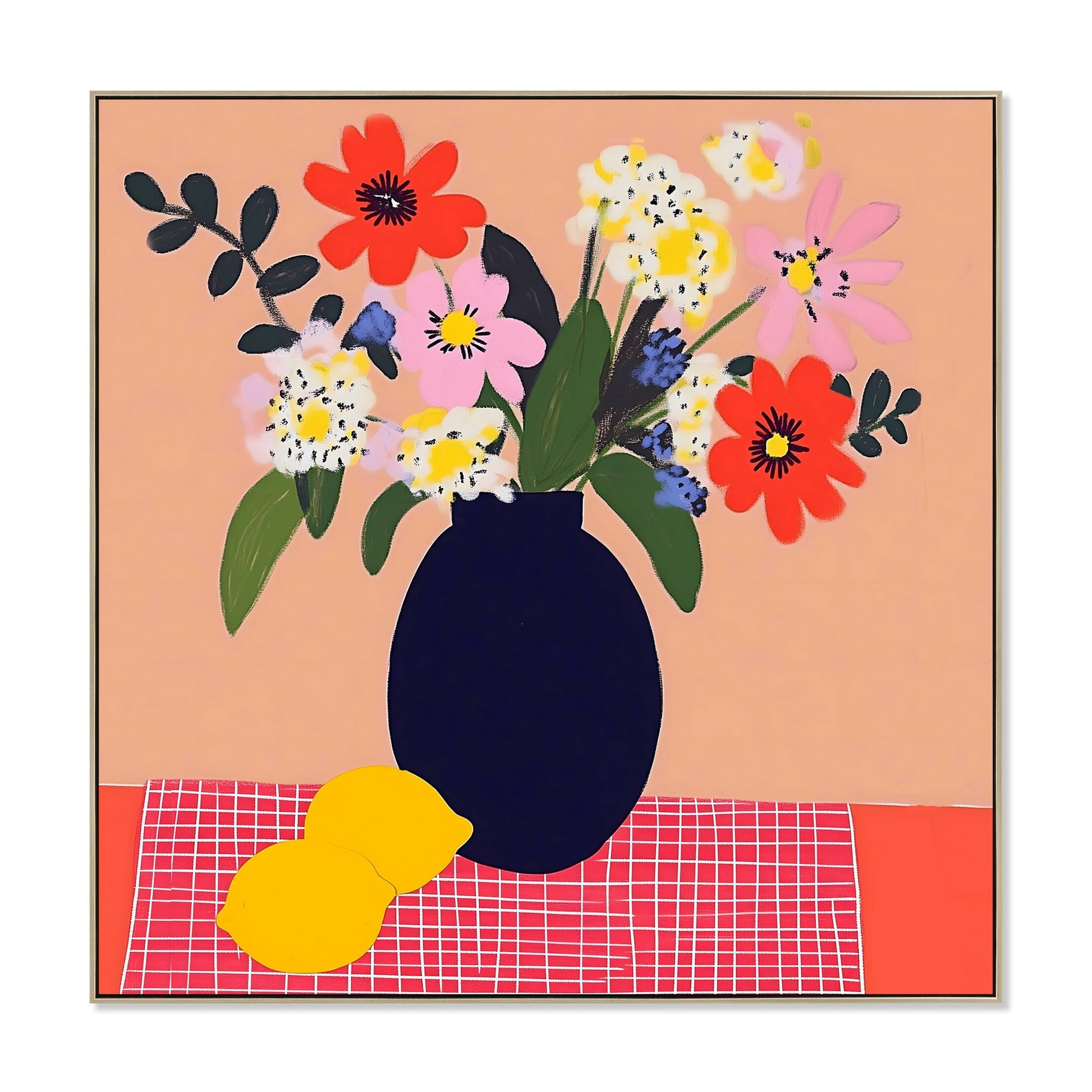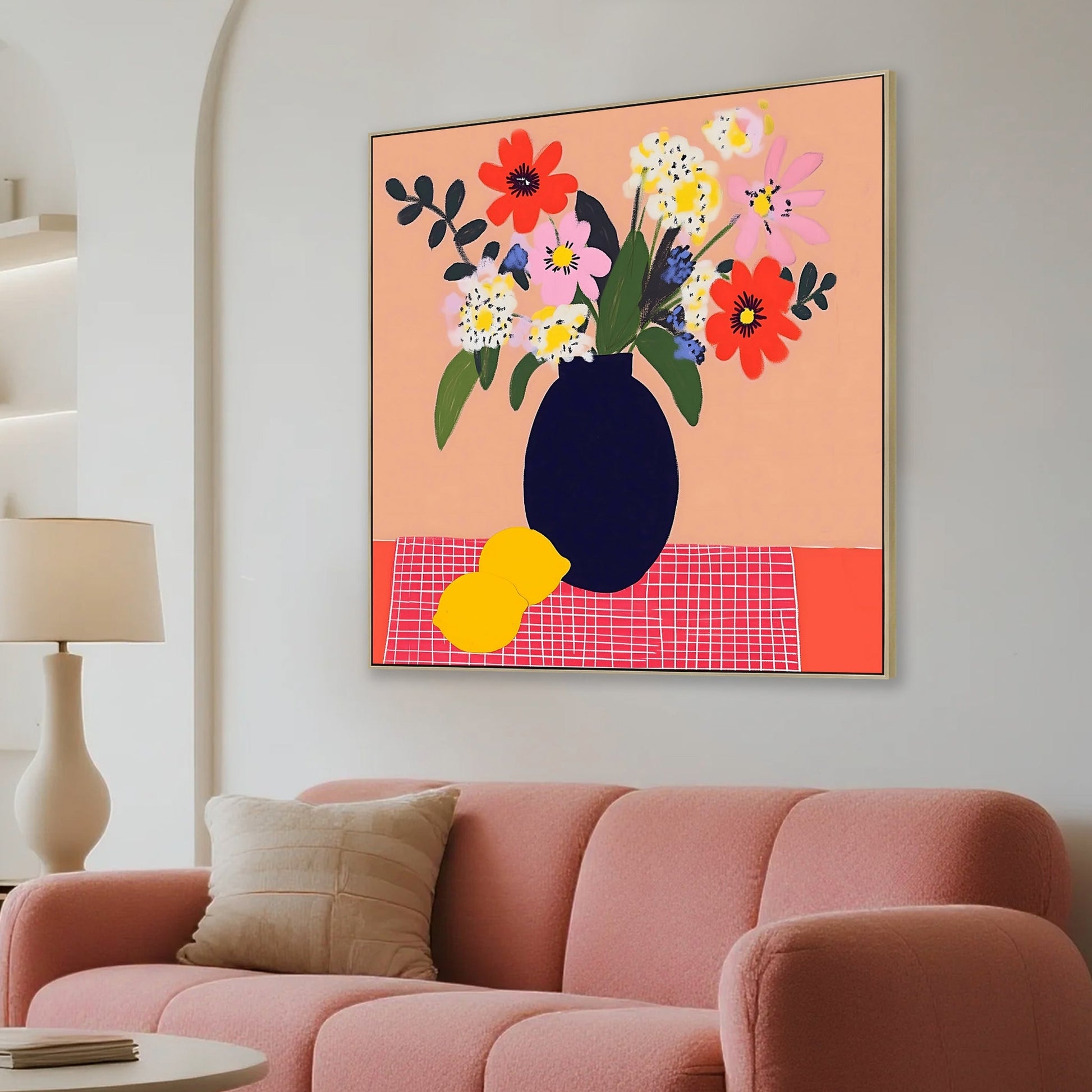 Celebrating colour, form, and joy, CAR12229-CLO 60 x 60cm Framed Canvas in Natural features a bold floral arrangement in a striking navy vase. Its soft coral backdrop and geometric grid base add a playful retro charm, making it a perfect focal point for creative, uplifting spaces.