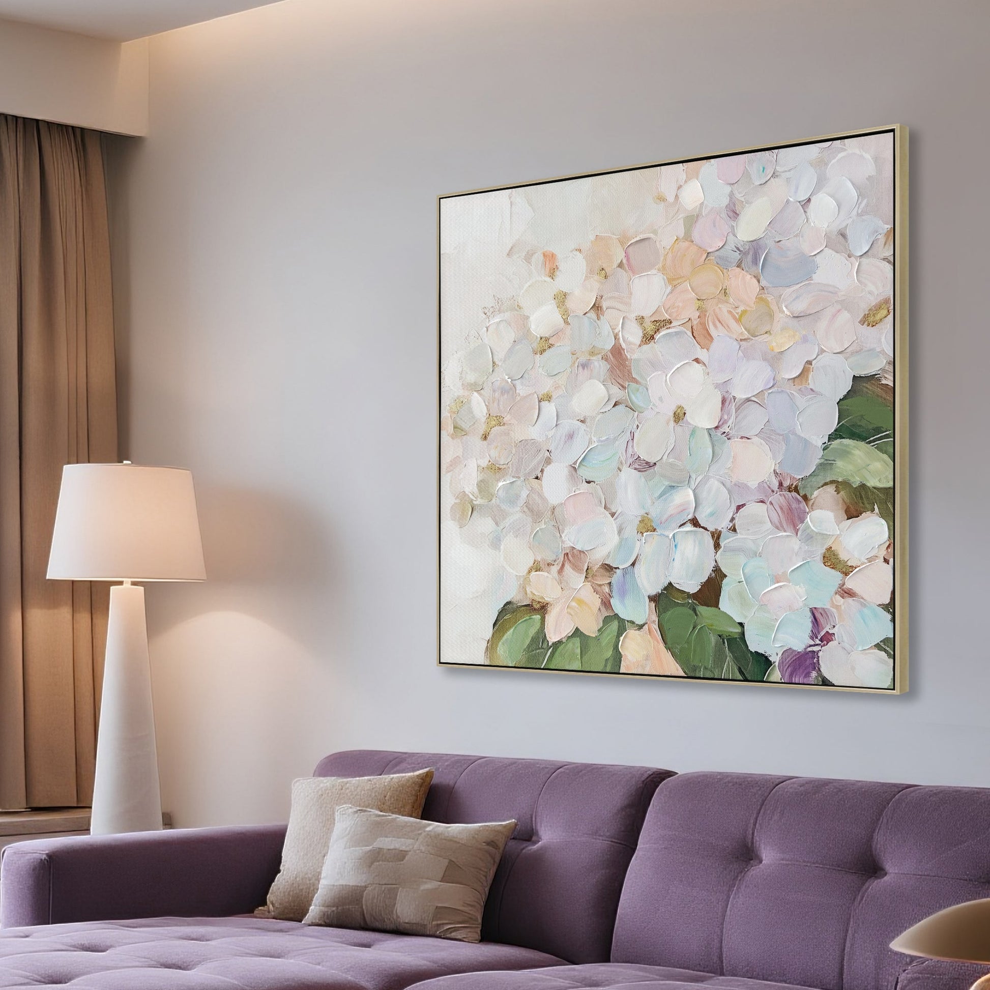 Evoking serene elegance, CAR12245-CLO 80 x 80cm Framed Canvas in Natural showcases a hand-painted bouquet of softly layered petals in blush, ivory, lilac, and sage. Each textured brushstroke adds depth and warmth, capturing the tender calm of spring florals in gentle light.