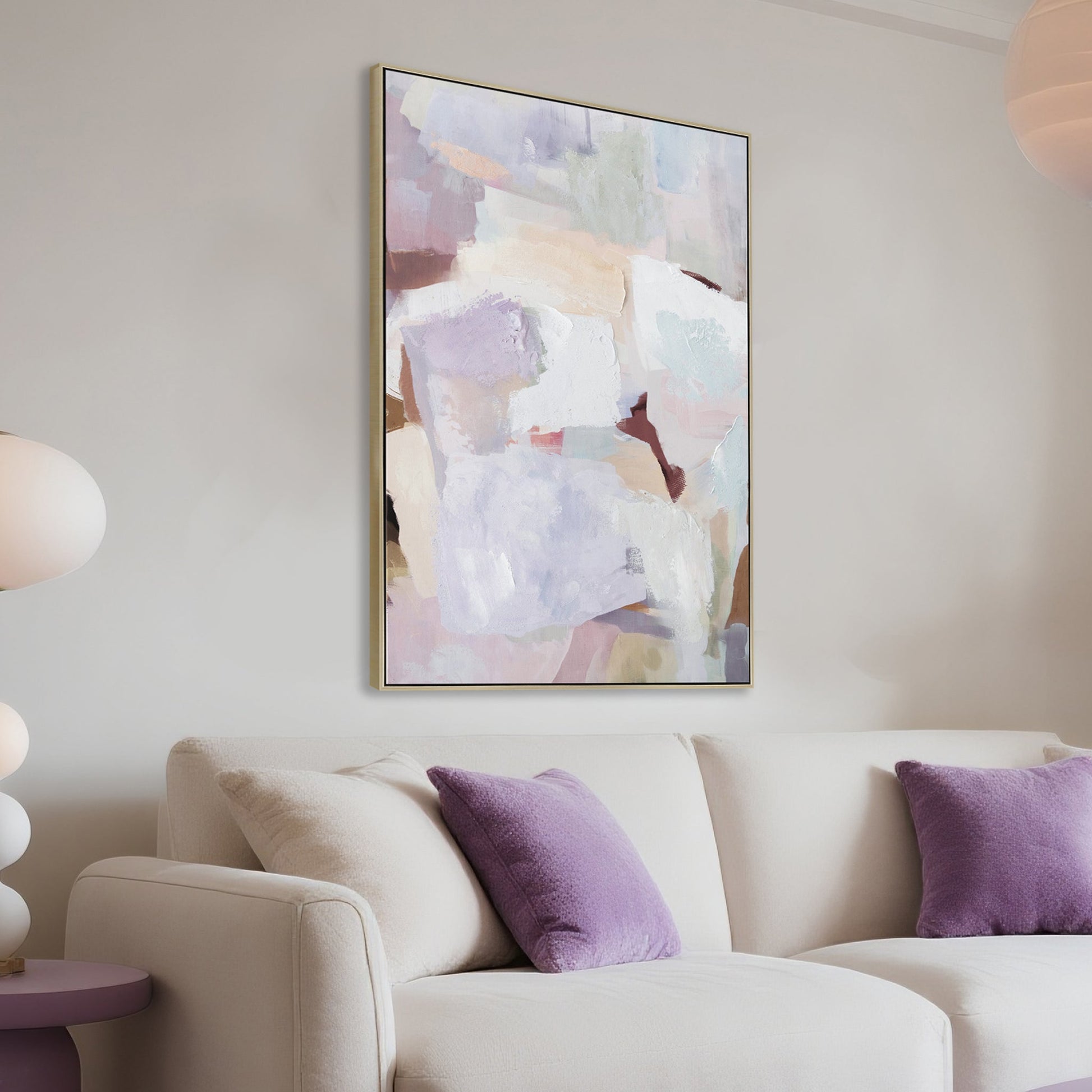 Capturing quiet elegance, CAR12246-CLO 90 x 140cm Framed Canvas in Natural layers soft tones of lavender, blush, ivory, and beige in a gentle, flowing composition. Its textured brushwork and balanced palette evoke calm movement and a dreamy sense of stillness.