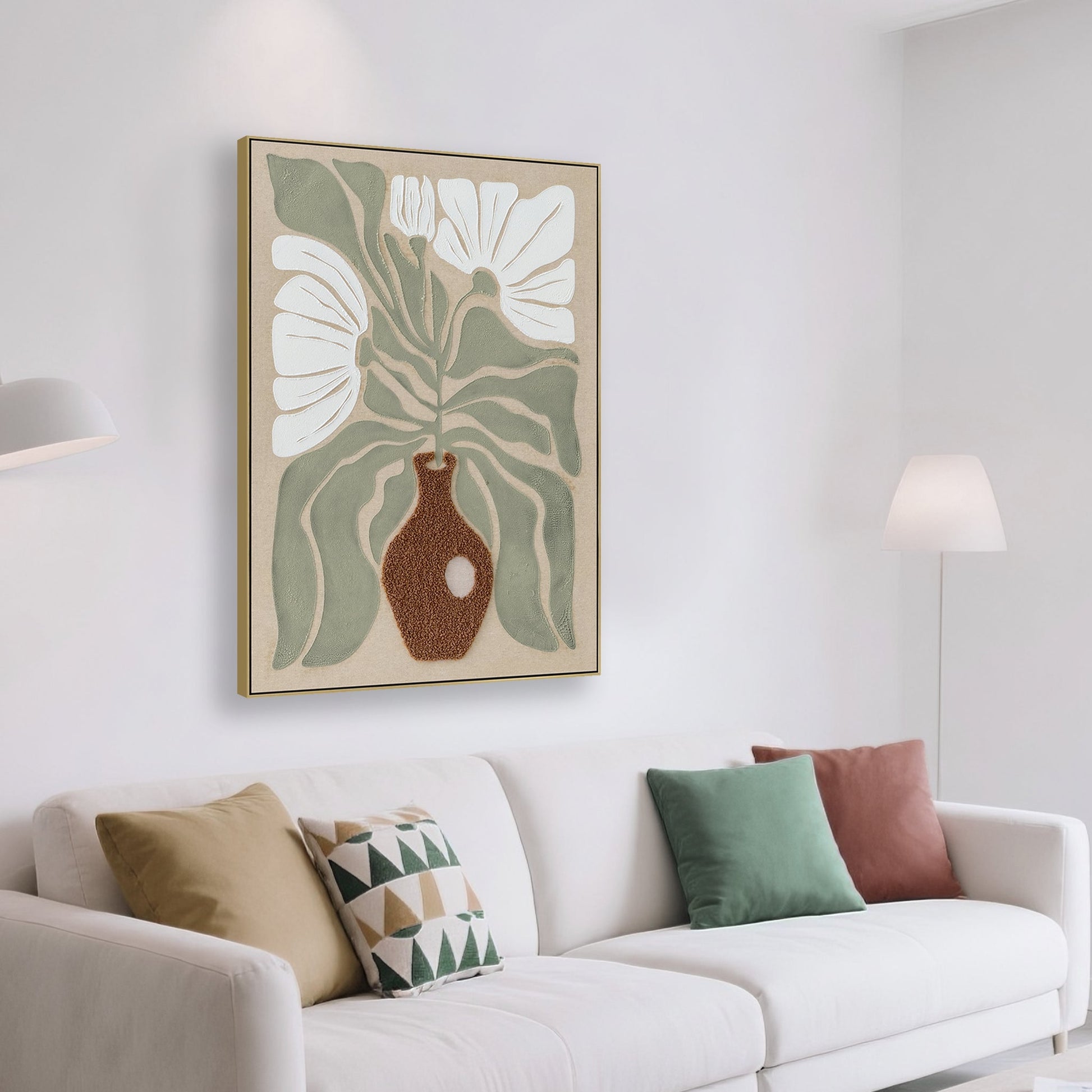 CAR12309-CLO 60 x 90cm Framed Canvas in Light Natural features abstract florals in sage green, warm brown, and creamy white. Its raised and boucle-textured detailing adds depth and warmth, making it a serene addition to bohemian, modern, or neutral interiors.
