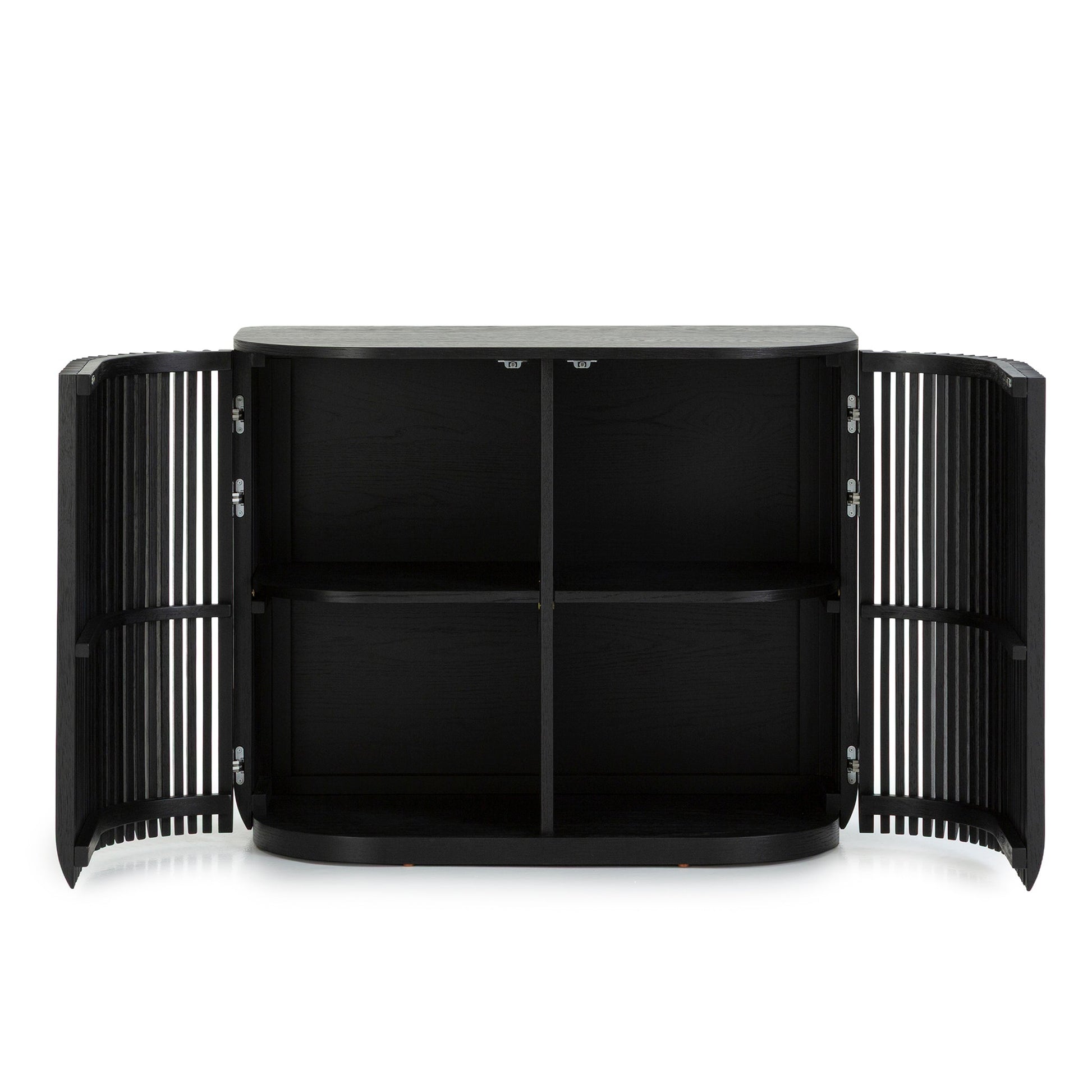 Behind its striking exterior, the CDT10681-CU 9.5m Sideboard Unit in Black Stain reveals generous shelving and concealed compartments for organized, clutter-free storage, blending elegance with utility in a sleek, polished form.
