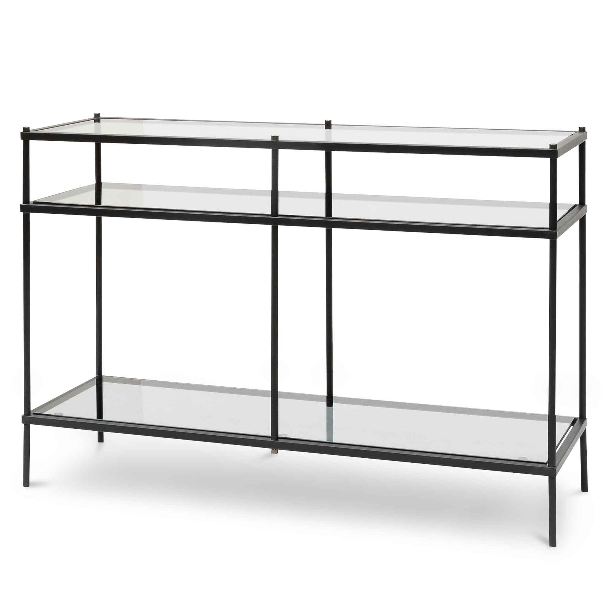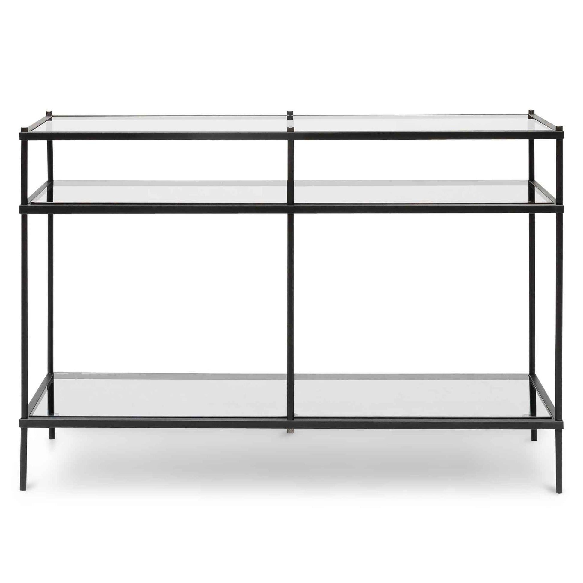 Bask in the luxurious design of CDT6395-KS 1.2m Grey Glass Console Table - Black Base and create an unforgettable storage and display. Made from sturdy black steel and tempered glass, revel in its timeless and functional design.