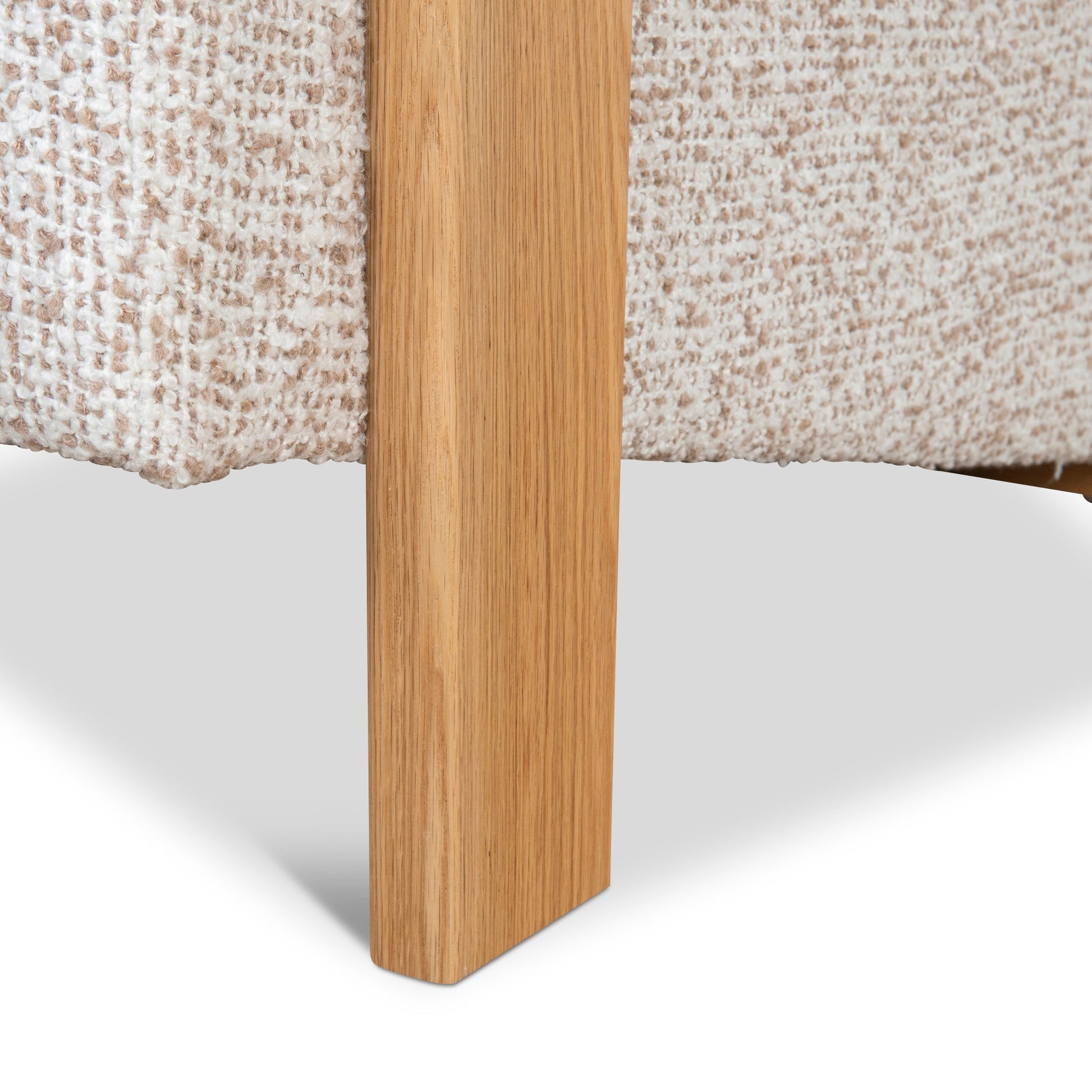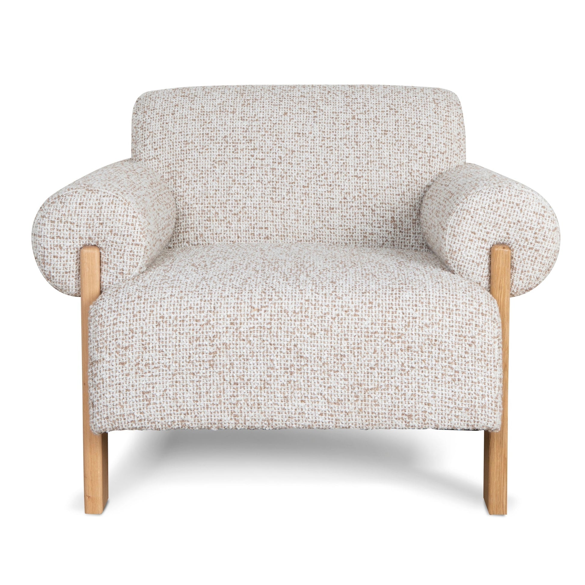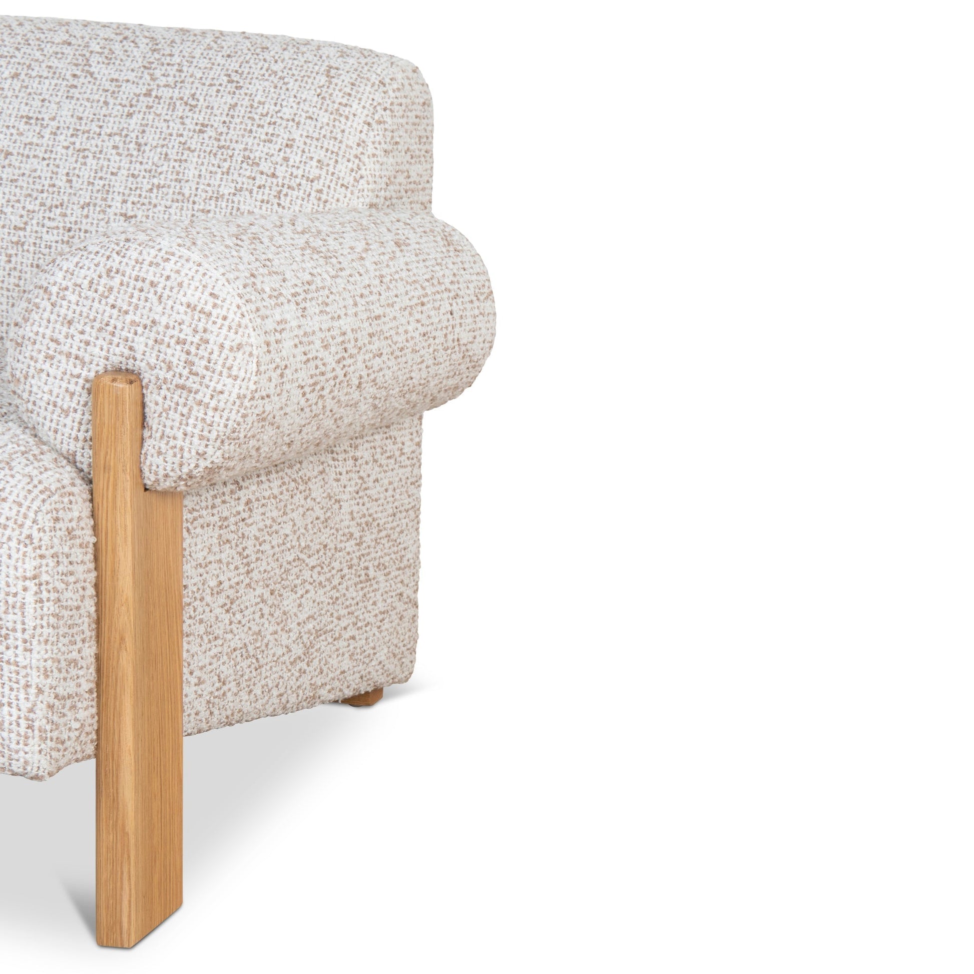 Experience refined comfort with the CLC10143-MY Fabric Armchair in Sand Beige. Its oak wood frame and legs exude timeless elegance.