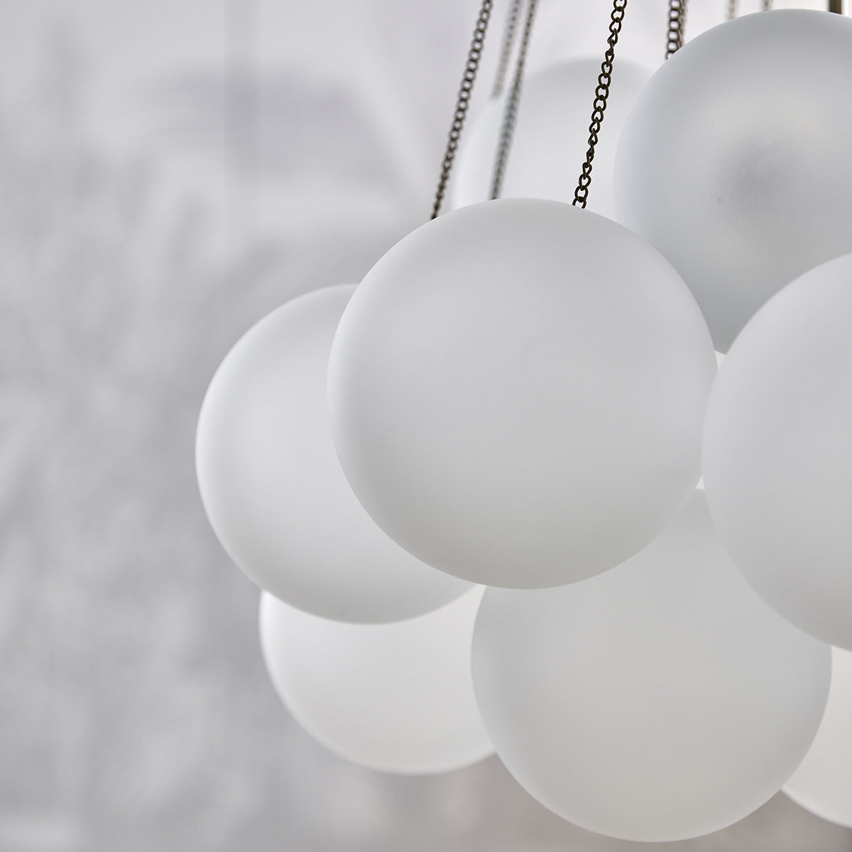 Creating a soft luminous form, the cloud pendant transforms your ordinary ceiling into a cloud-filled sky. Glass orbs are frosted by hand to create this splendid and delicate pendant, unique in design and a true piece of art. Reminiscent of a dreamy cloud a soft glow is refracted from central light sources through to the surrounding cluster of orbs.