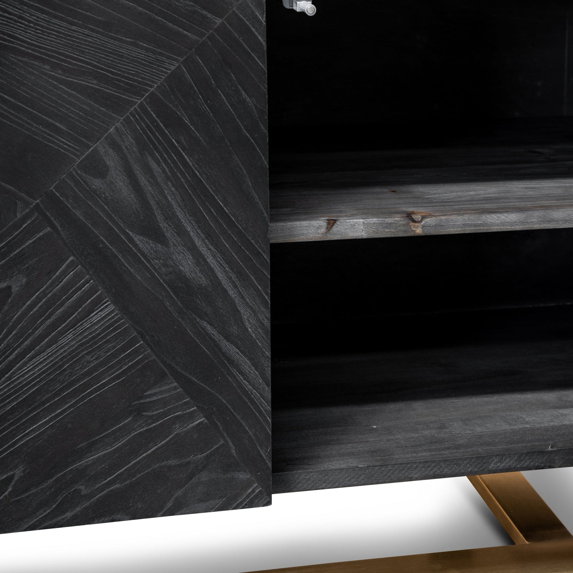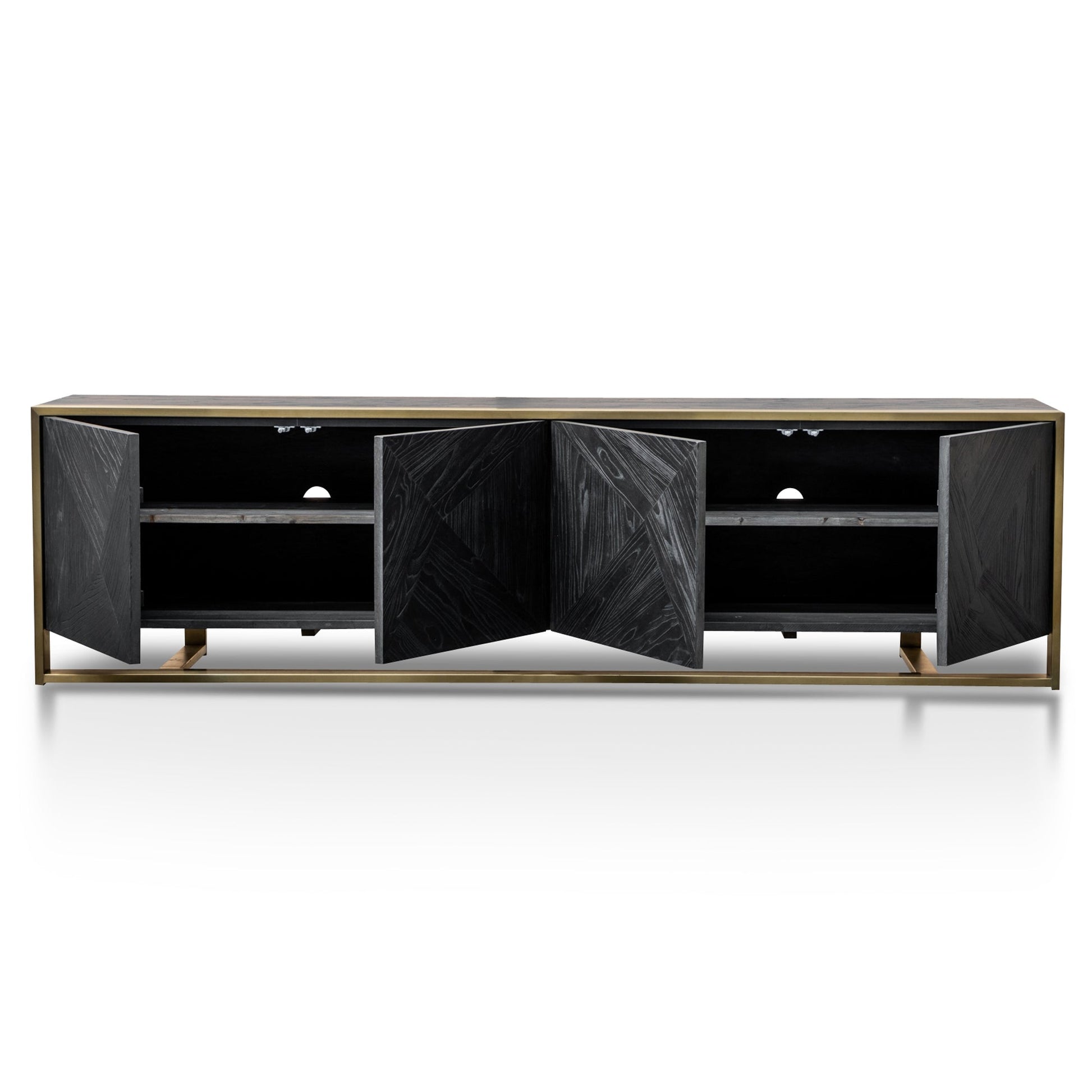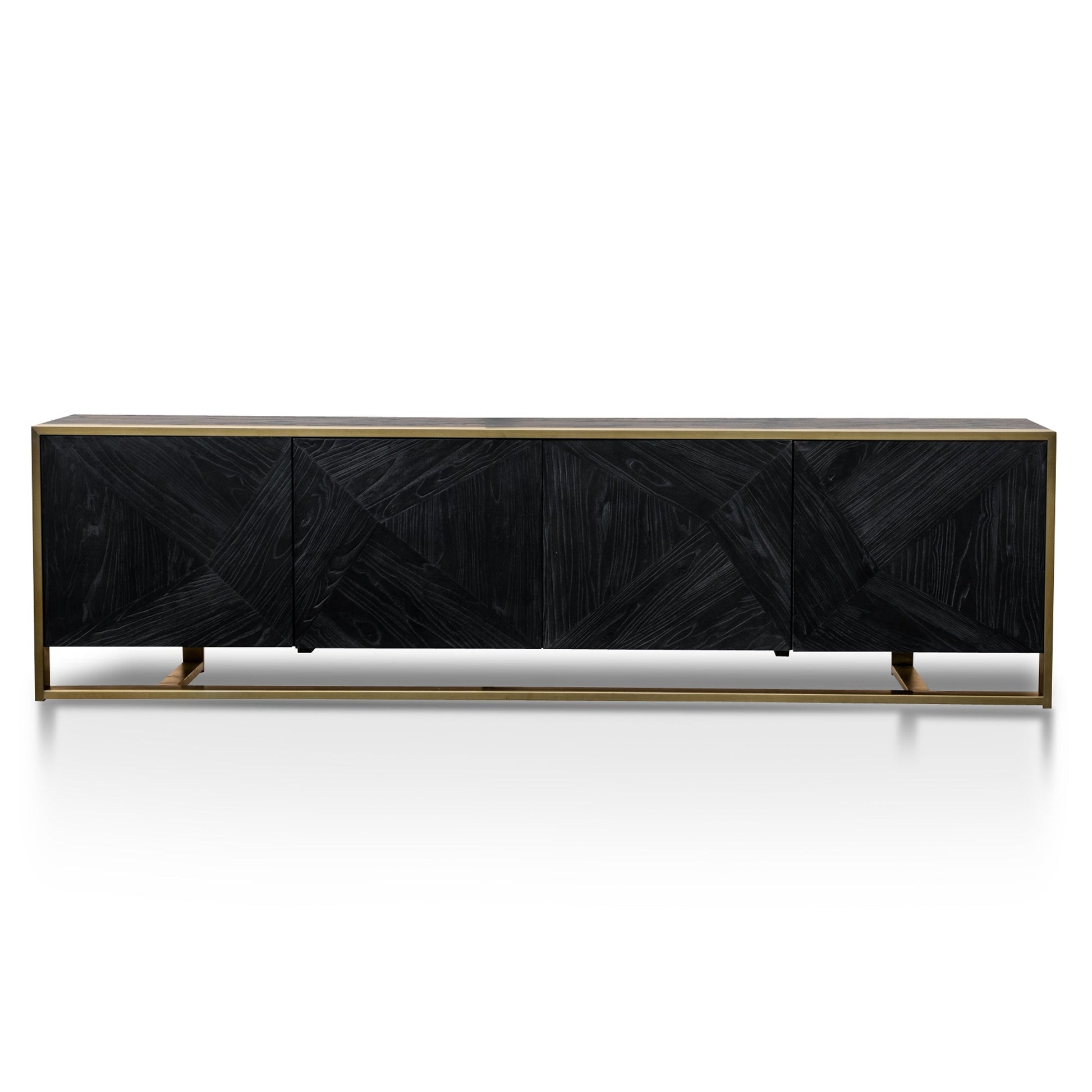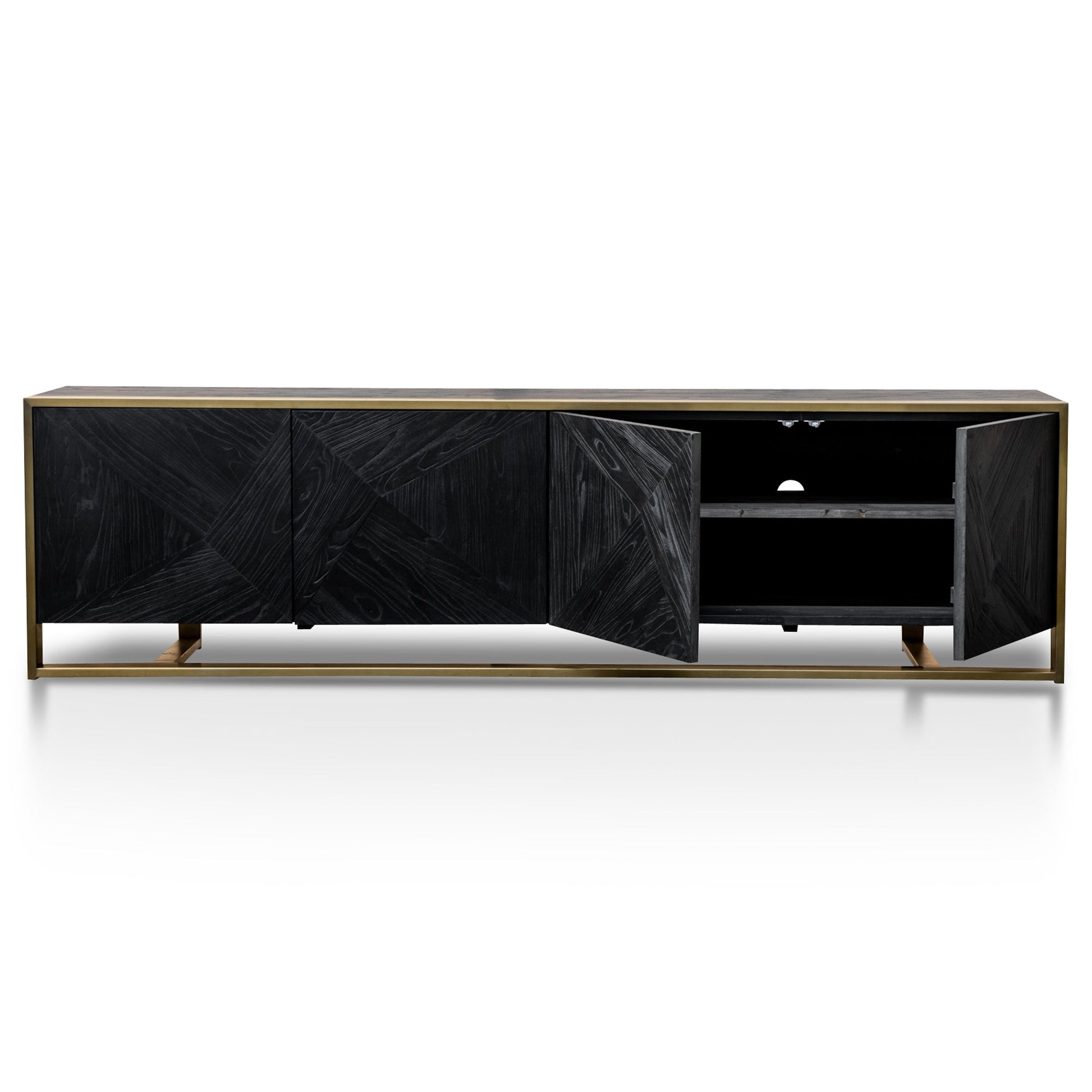 Opt for ample storage and contemporary design with the CTV2935-NI 2.2m Entertainment TV Unit - Golden, a timeless piece that showcases a stunning interplay of styles and materials. Featuring a structured modern silhouette, the black fir wood and gold brushed iron frame elevates the industrial inspired design into one of elegance and opulence.