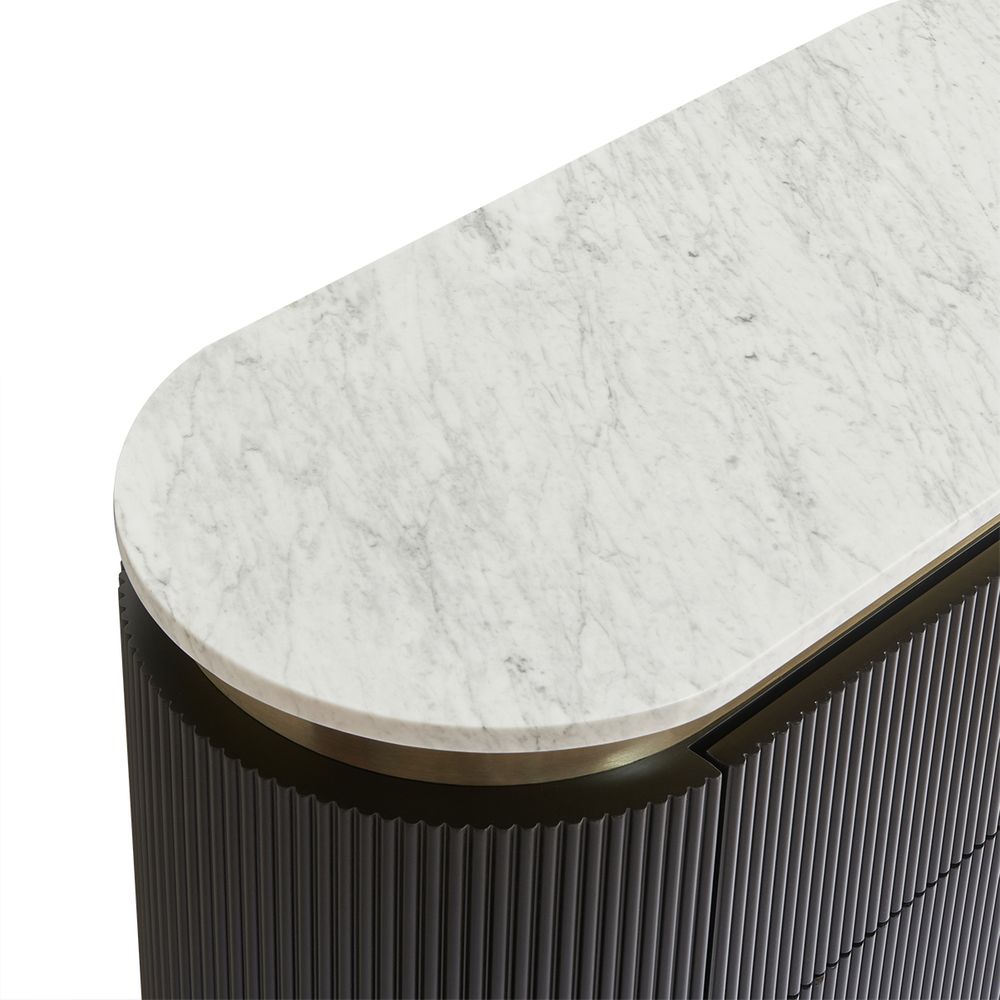 An embodiment of modern craftsmanship, the Demarco chest of drawers in black exudes sophisticated allure. Showcasing a ribbed texture and sleek brass accents, this stunning piece is topped with a gracefully curved white Carrara marble top. Its three spacious drawers offer generous storage, combining functionality with aesthetic elegance. Supported by streamlined brass legs, the Demarco chest of drawers delivers timeless style and effortless glamour to any bedroom or living space.