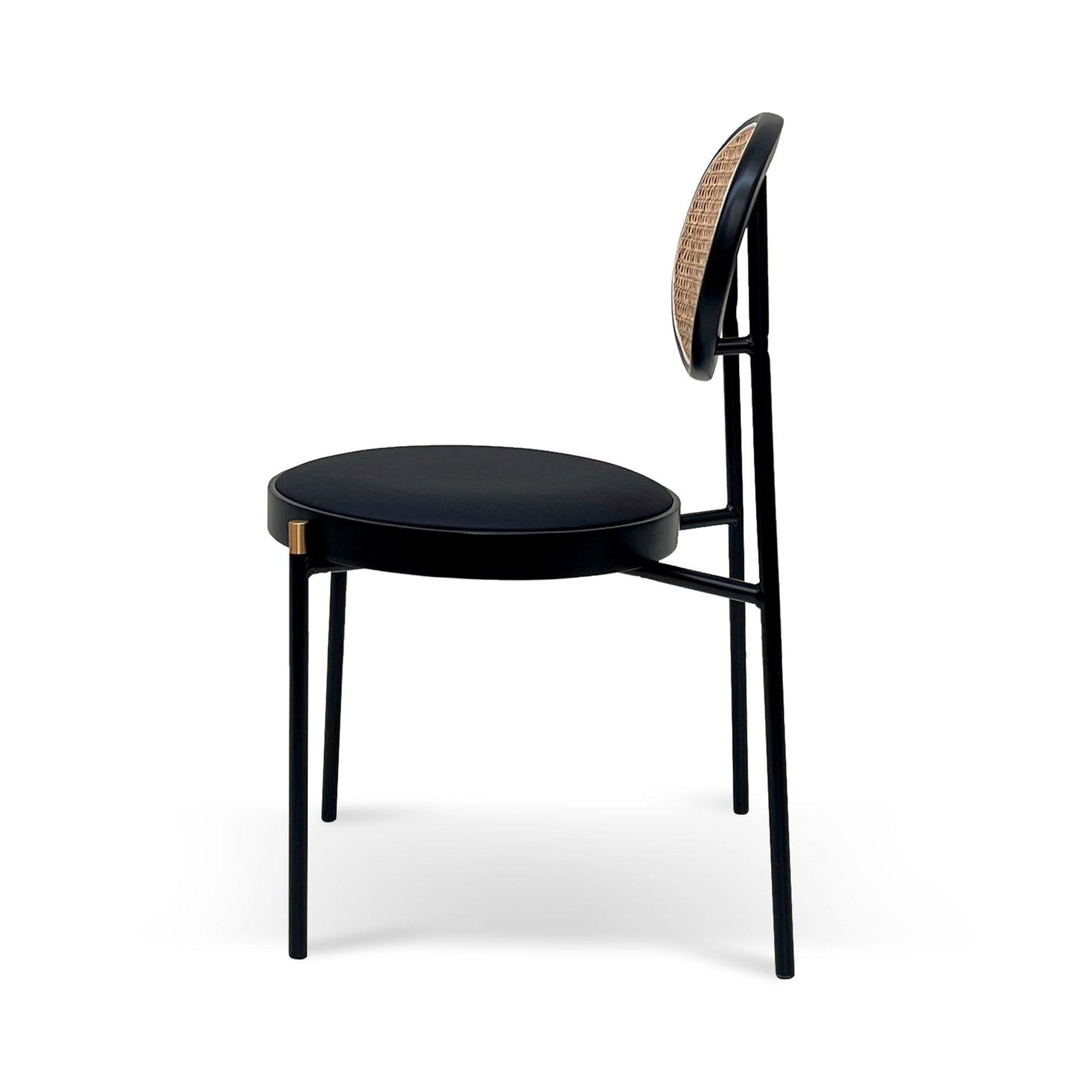 A work of furniture design that leaves you seated with amazement. The Natural Rattan Dining Chair - Black with Brass Cap brings rattan's natural beauty to a whole new level of grandeur and uniqueness. Its striking design, combining black metal, natural beechwood rattan, and luxurious accents, will enhance any dining space with both style and comfort.