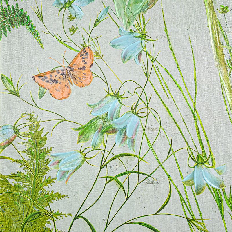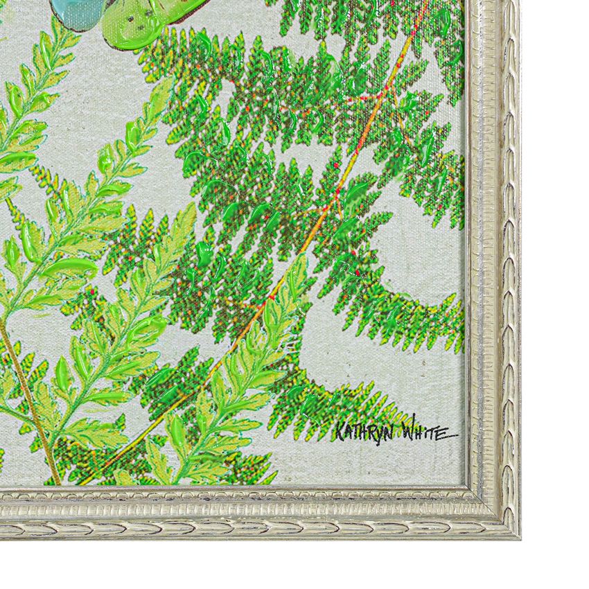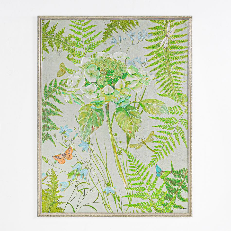 This exquisite artwork by Kathryn White, a celebrated American artist, is a vibrant celebration of nature's elegance. Featuring intricate fern leaves, delicate hydrangeas, and enchanting butterflies, this painting reflects Kathryn's inspiration from the classic charm of European landscapes and her Massachusetts studio. Painted with timeless techniques, it captures the seamless blend of tradition and contemporary artistry. A perfect addition to elevate home decor, its vibrant green palette radiates tranquillity and sophistication.