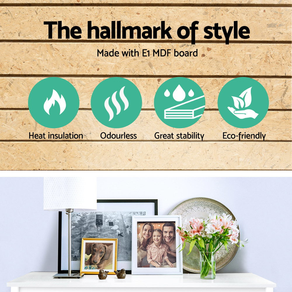 Introducing the Artiss Wooden Storage Console Table in White, a must-have for any stylish and contemporary home. Made from eco-friendly MDF board, this console table boasts a timeless design that is both durable and well-proportioned. The side cross bracing not only adds a unique touch, but also provides reinforced support. With three tiers of shelving, you'll have plenty of space to display your favorite decorative items, collectibles, and even books. The NC lacquer paint finish gives the table a flawless and smooth touch, adding to its overall elegance.