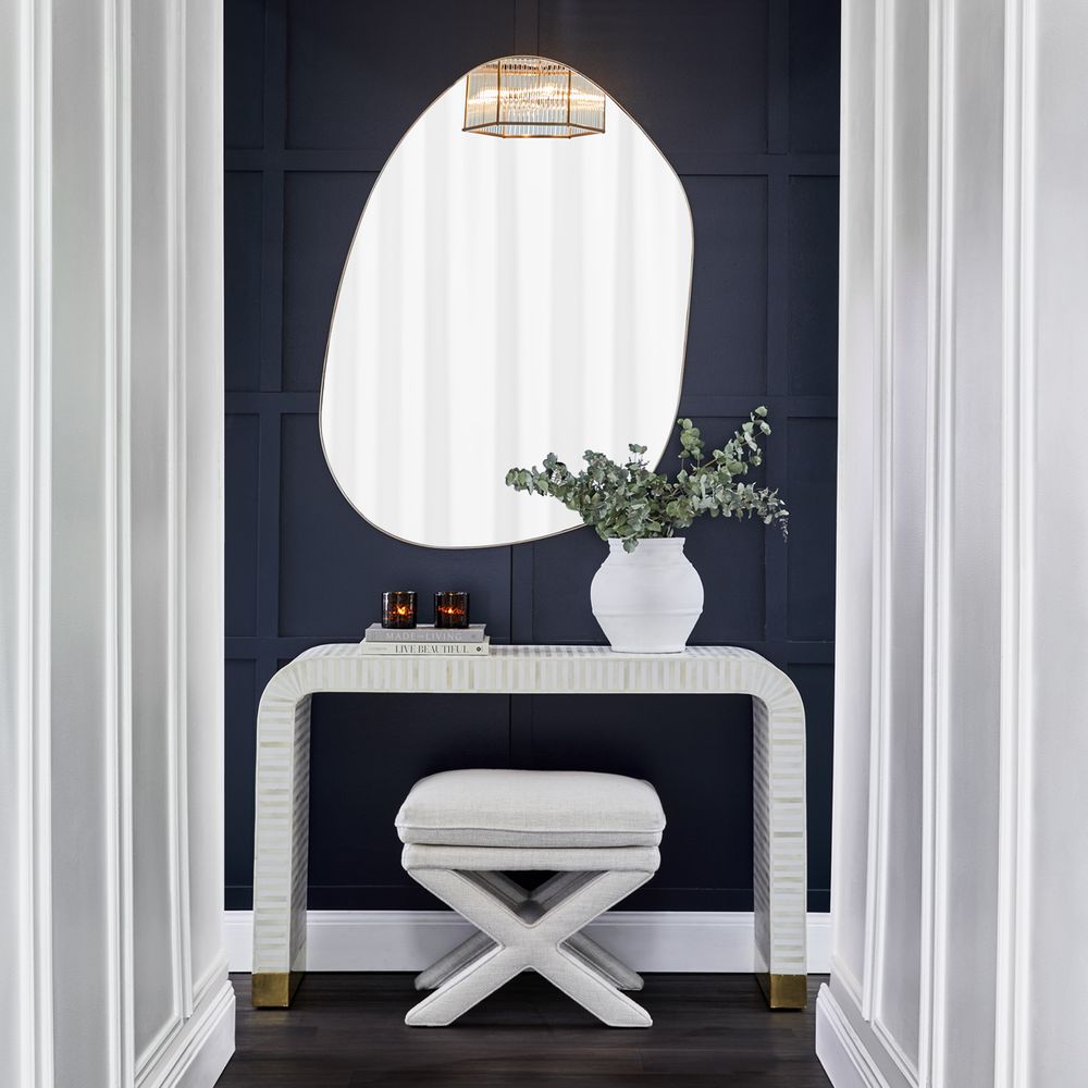 Inject organic elegance into your interiors with the Pollock wall mirror. Available in two sizes and colour finishes, the small measures 86 x 120cm and can be hung either vertically or horizontally. Finished in a luxe antique gold, this striking mirror softens spaces with its meandering oval frame while its lustrous tone pronounces distinct textural richness. Also available in black.