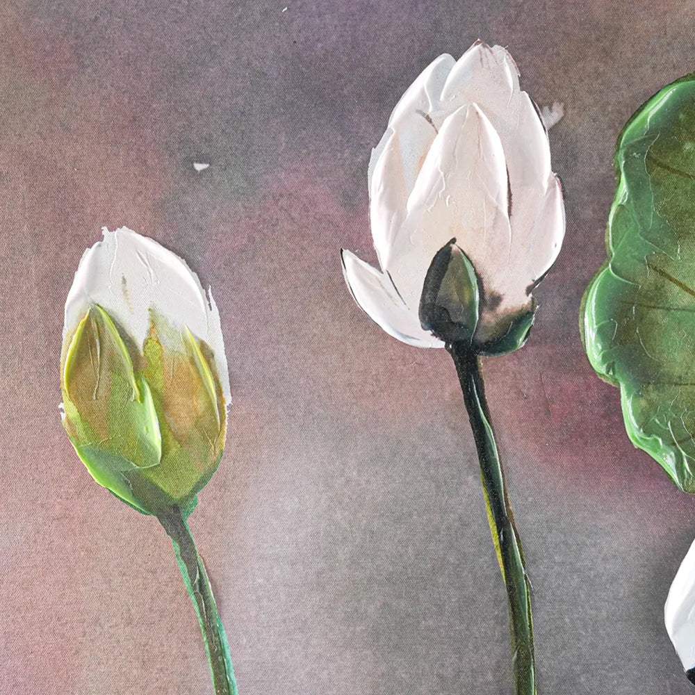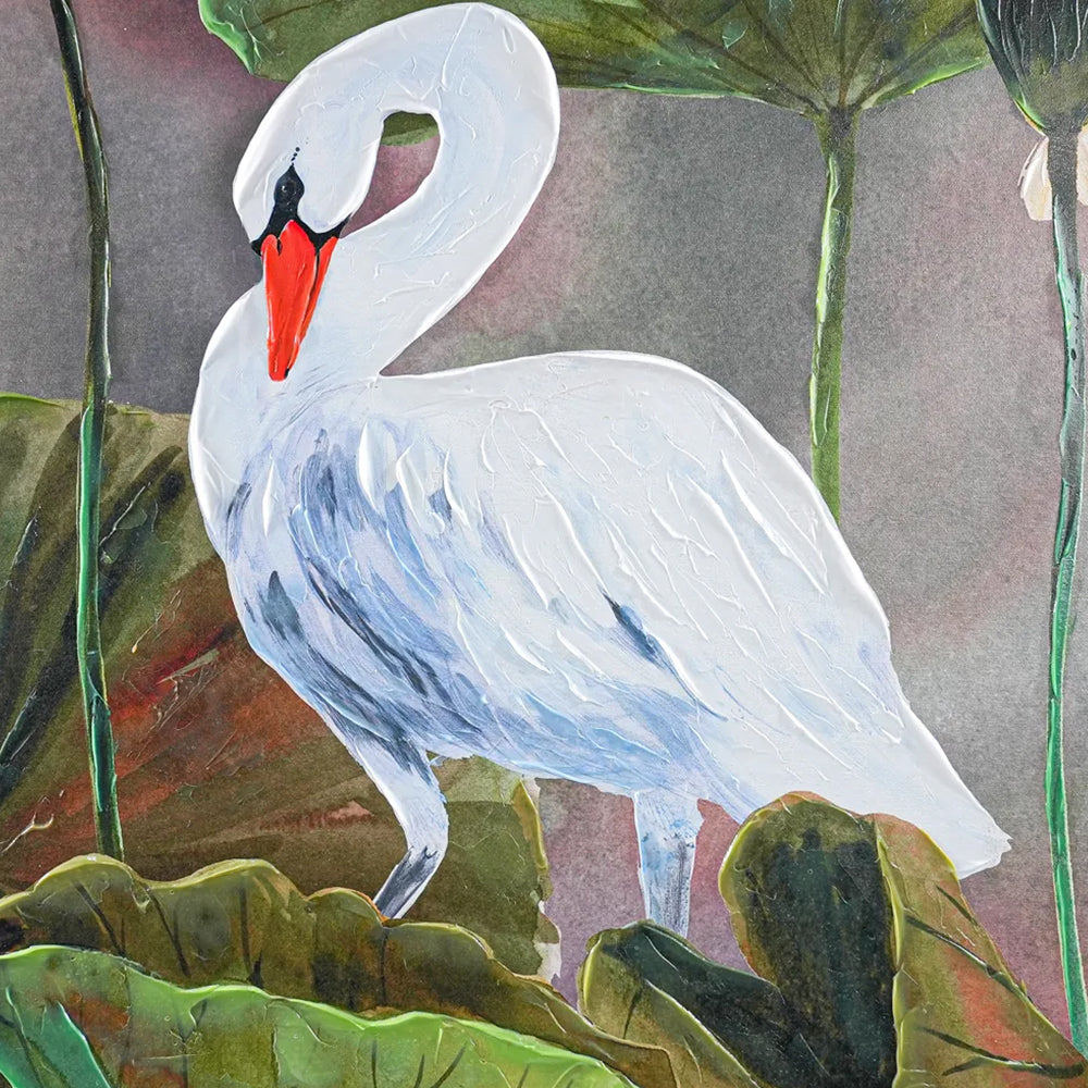 Celebrate elegance with Shay's exquisite swan-inspired artwork, an intricate blend of delicate textures and vibrant hues. This captivating piece, crafted by renowned American artist Shay, reflects her transition from a celebrated Cordon Bleu chef to a masterful painter. Featuring serene lotus blossoms and a graceful swan, the painting exudes tranquillity, inspired by the lush beauty of nature. Perfect for contemporary or classic interiors, Shay's art combines culinary precision with artistic flair, creating timeless décor for your space.